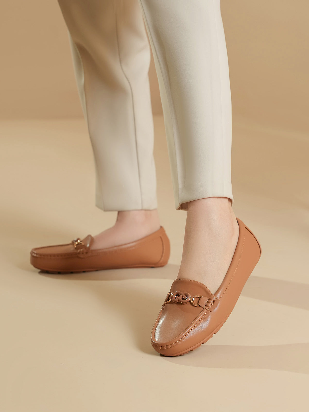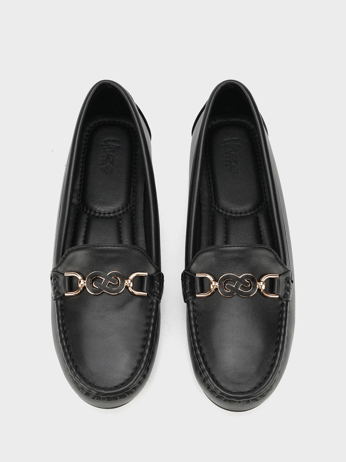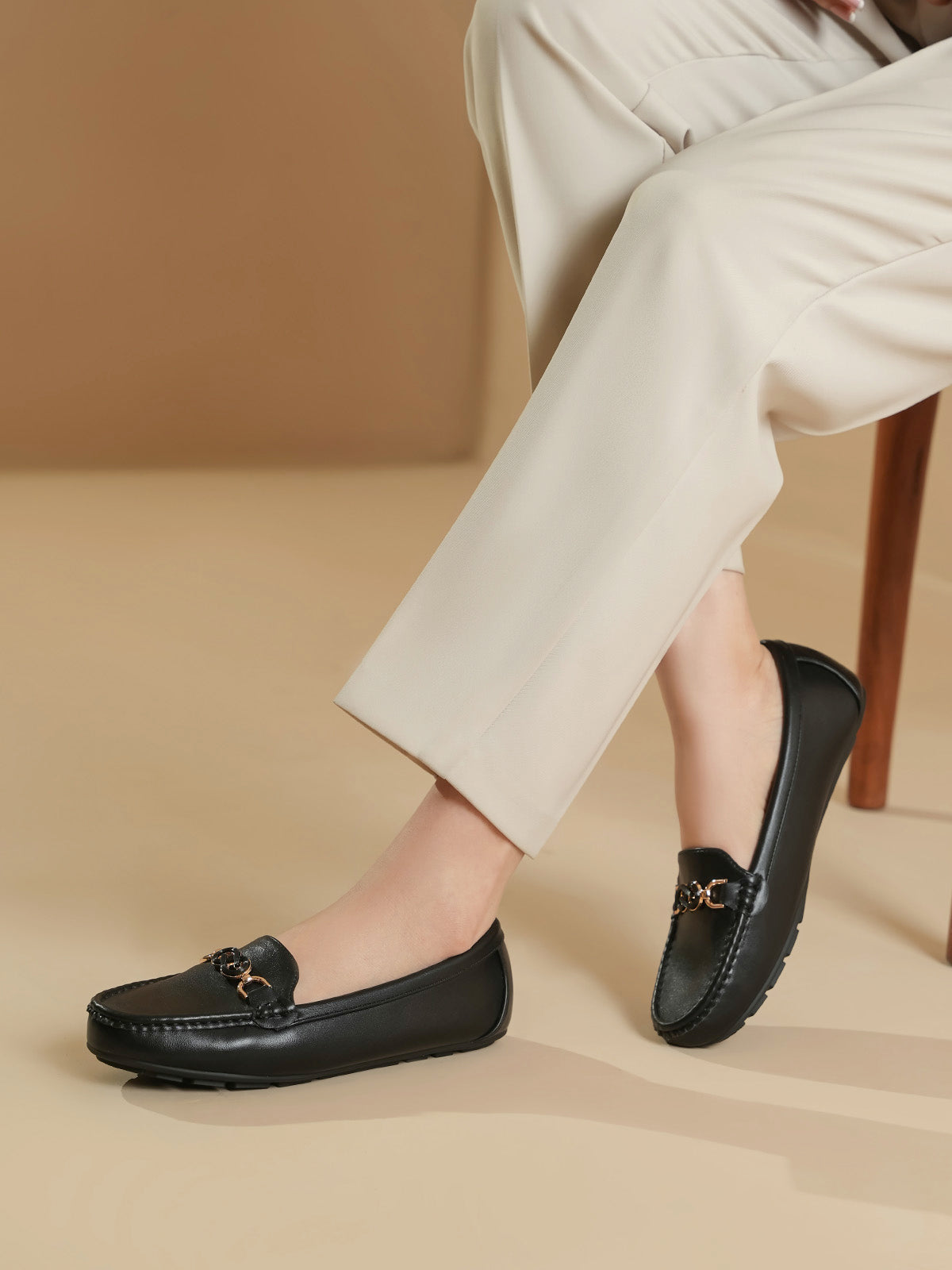 Step out in style with these elegant moccasins, featuring a sleek design and a fashionable buckle on top. Easy to slip on and made for all-day comfort, they’re perfect for both casual and semi-formal looks.