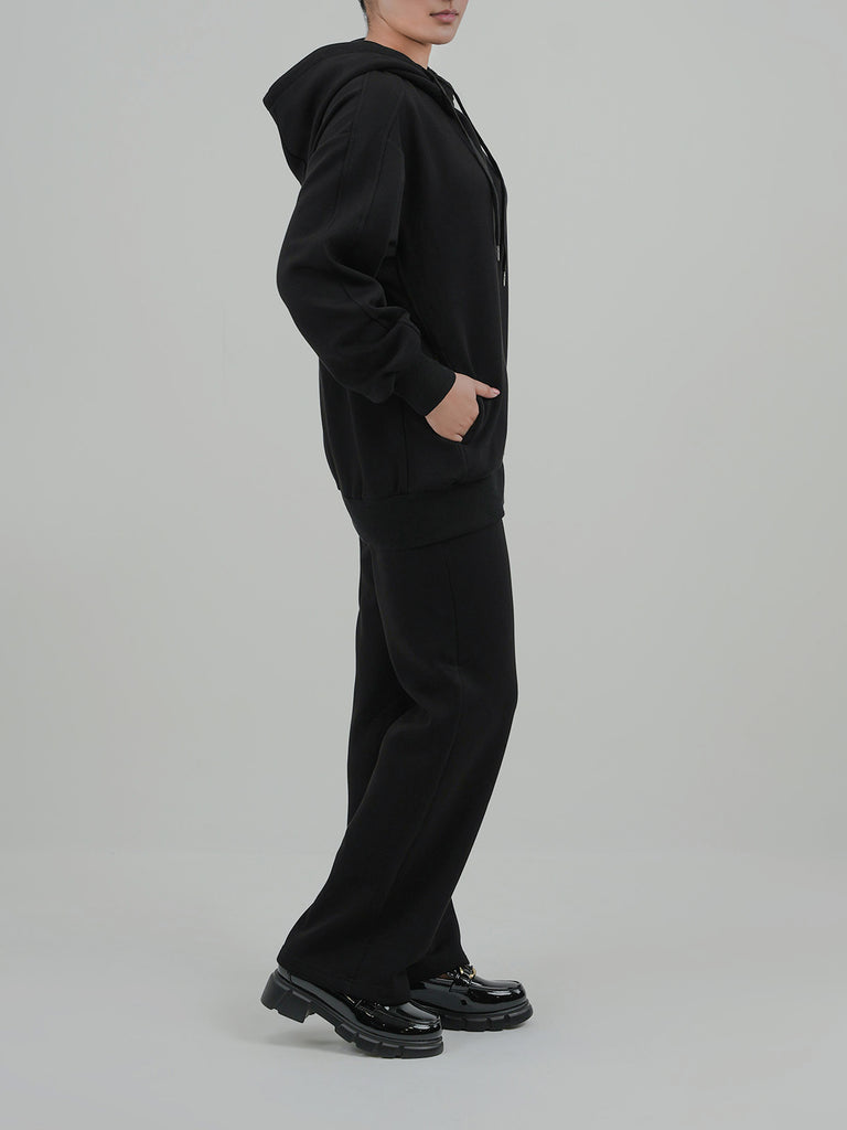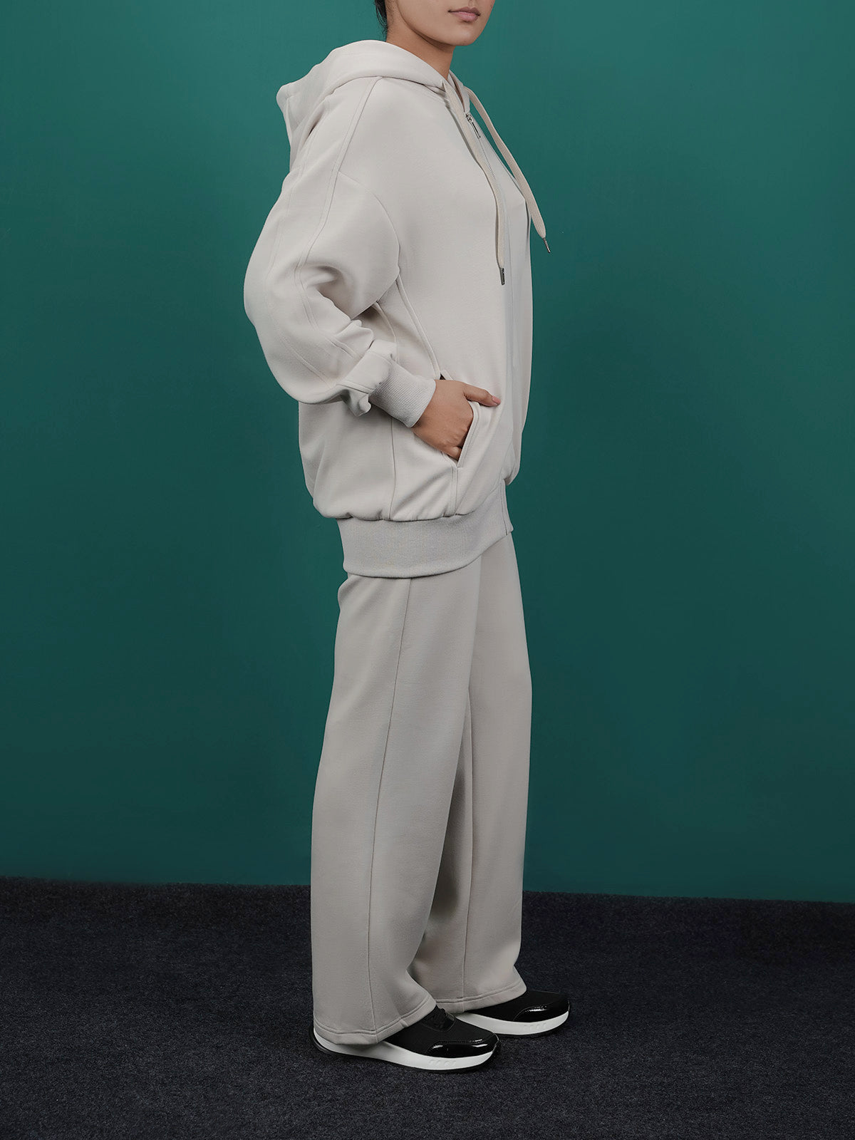 This women's fleece co-ord set is perfect for a cozy, casual look. It comes with a zip-up hoodie and matching pants with zip detail at the bottom. Made from soft fabric, it's great for everyday wear and staying warm.
