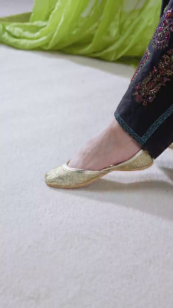 Bring traditional charm to your style with this beautifully designed tilla work women khussa. Adorned with delicate golden and silver tila embroidery, it reflects timeless craftsmanship and elegance. The soft inner lining and cushioned sole ensure lasting comfort.