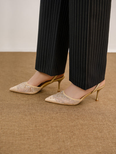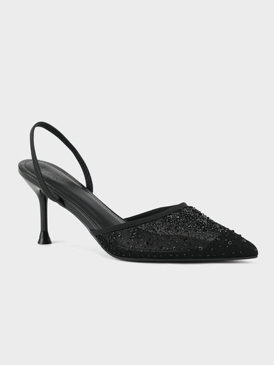 Add a feminine flair to your outfit with crystal detailing net deisgned pointy-toe back-strap shoes, perfect for dinner outs or wedding nights.