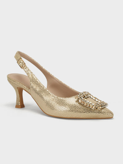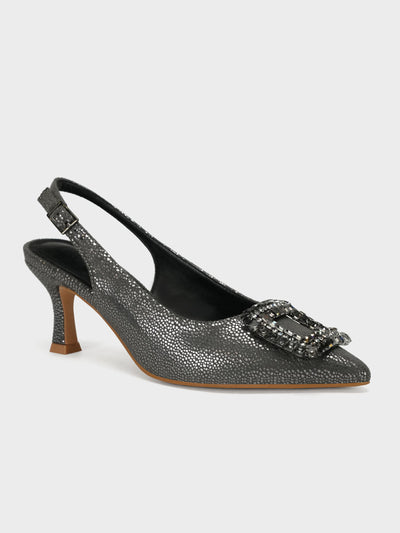 Step out in style with these shimmery pointy toe back strap spool heels. Featuring subtle rhinestone detailing buckle on vamp along the back strap, these sandals add a touch of sparkle to your outfit. The sharp pointy toe and sleek spool heel ensure a polished look, making them perfect for special events or nights out.