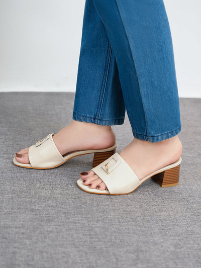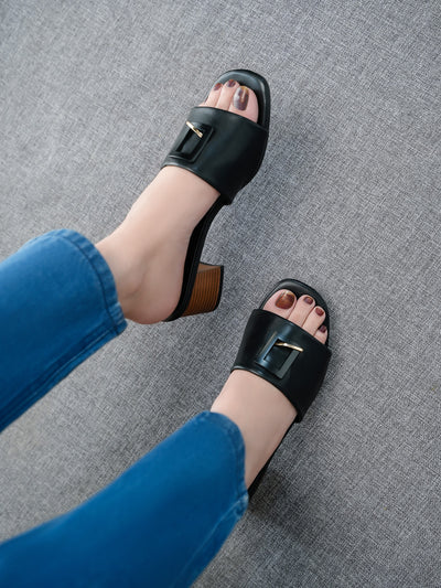 Turn heads with these open-toe sandals featuring high chunky heels and a sleek, modern design. Perfect for adding a bold statement to any ensemble. Easy slip on wearing with buckled adorned design makes it perfect for everyday.
