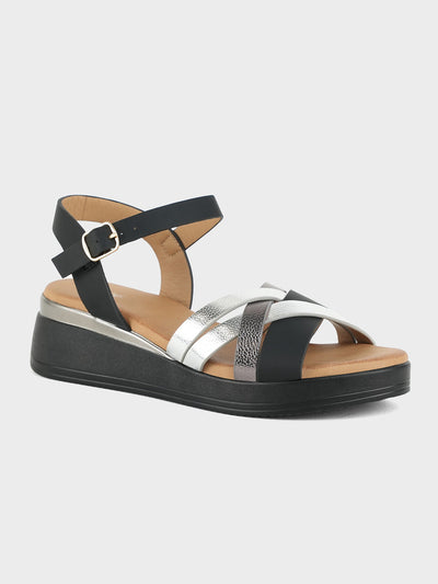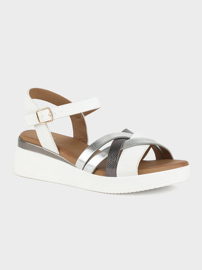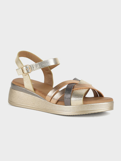 Shine bright with these metallic wedge-heeled sandals, featuring a strappy upper design that adds glamour to your evening ensemble. Ankle strap comes with adjustable bucle closure and comfy insole.
