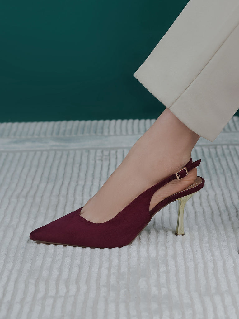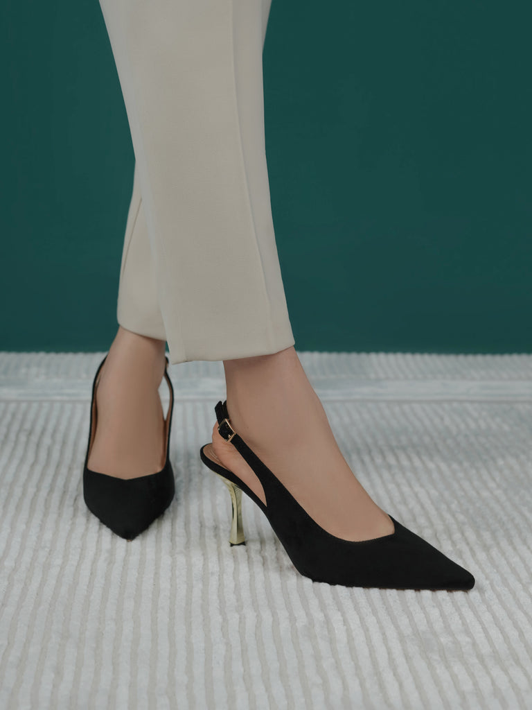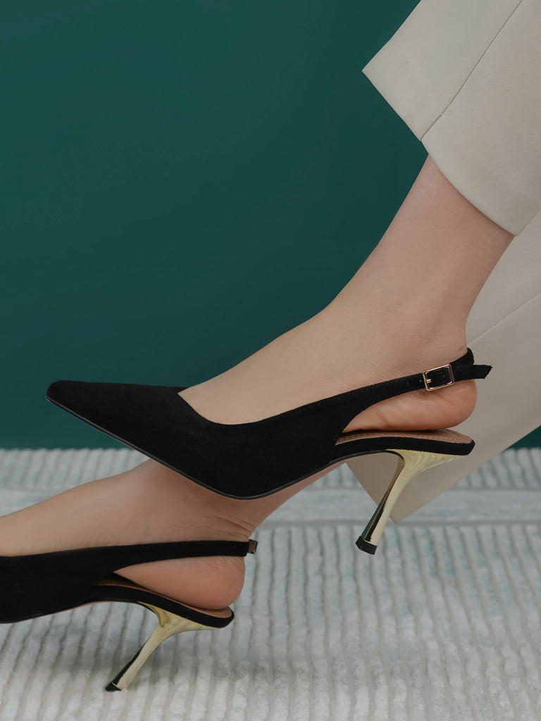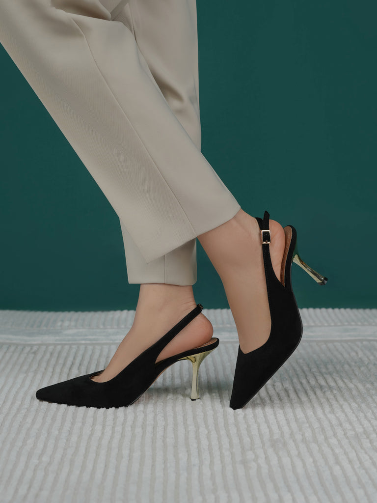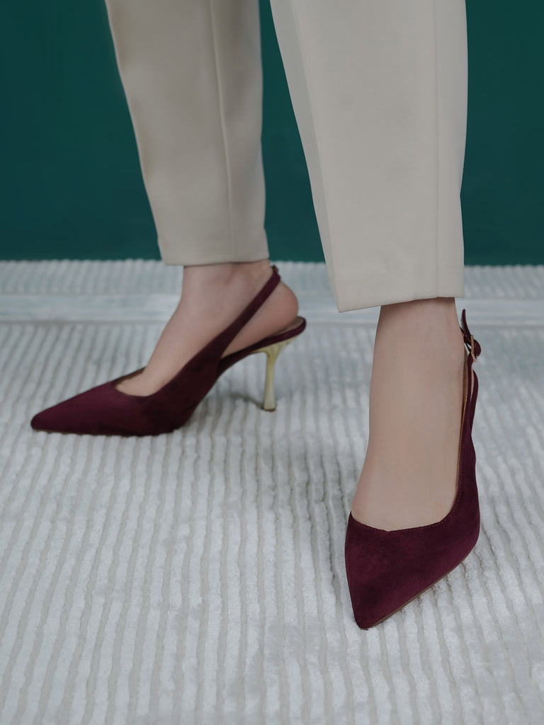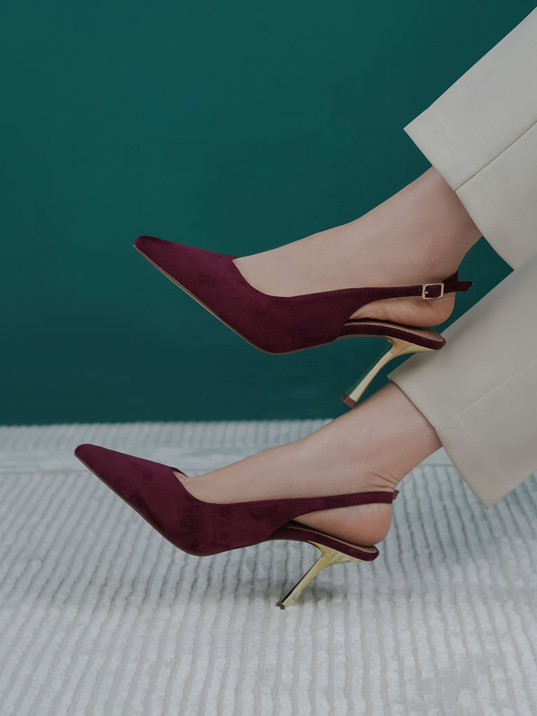 Add elegance to your steps with these pointed-toe women’s sandals featuring a stylish slingback buckle. Crafted in a soft suede finish, they offer a refined look with a sleek stiletto heel for just the right amount of height.