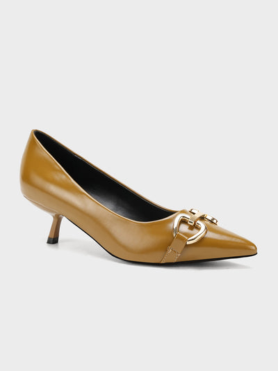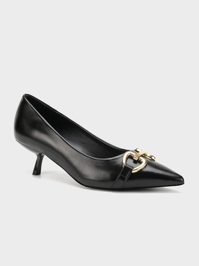 Elevate your style with these elegant pointed-toe court shoes, designed with a glossy finish and bold gold chain detail for a touch of luxury. A timeless design that blends sophistication with modern flair.