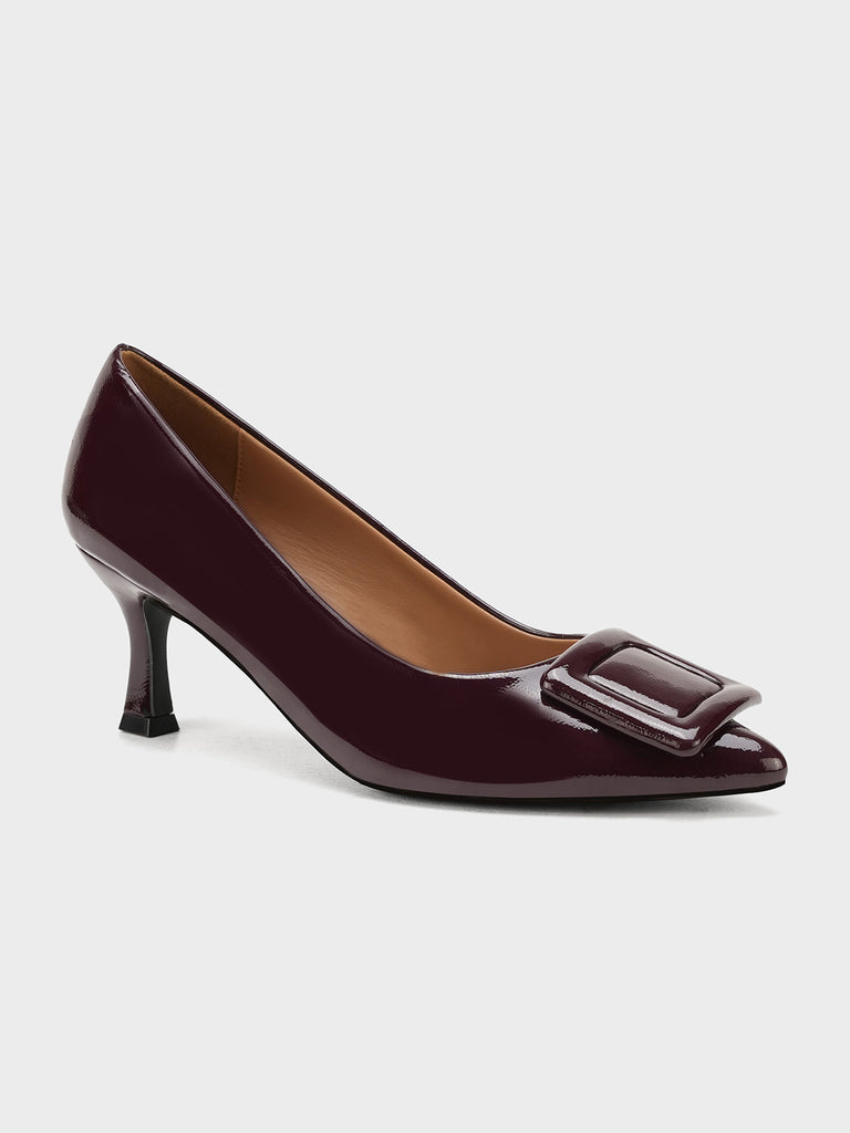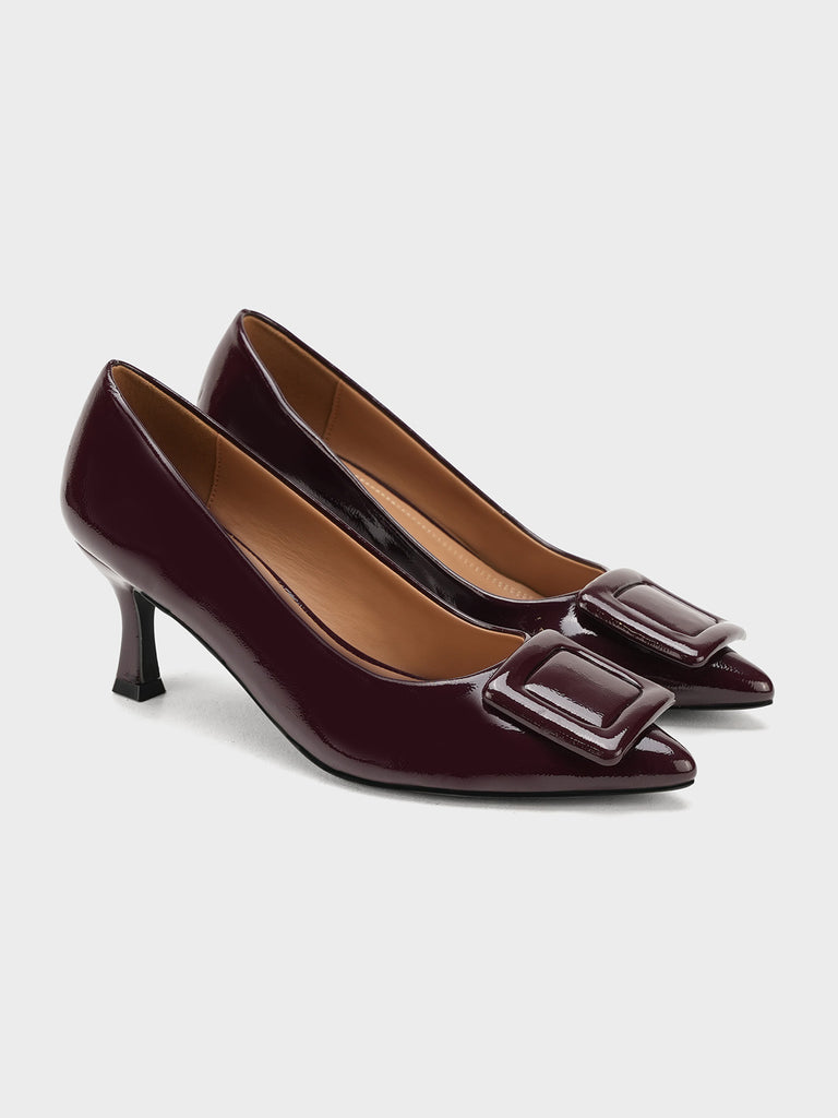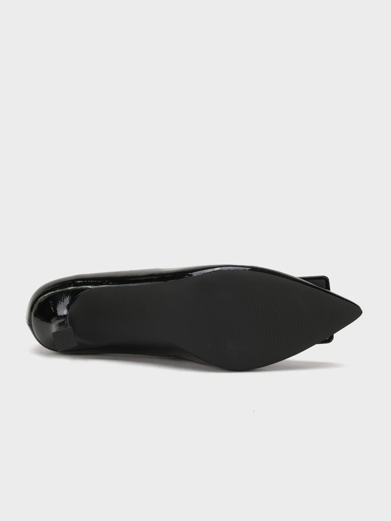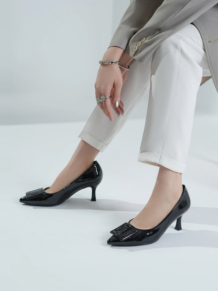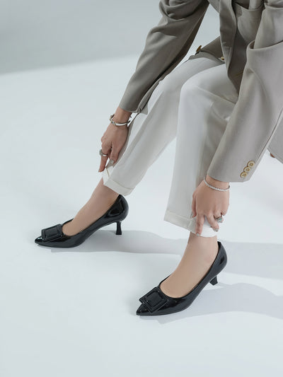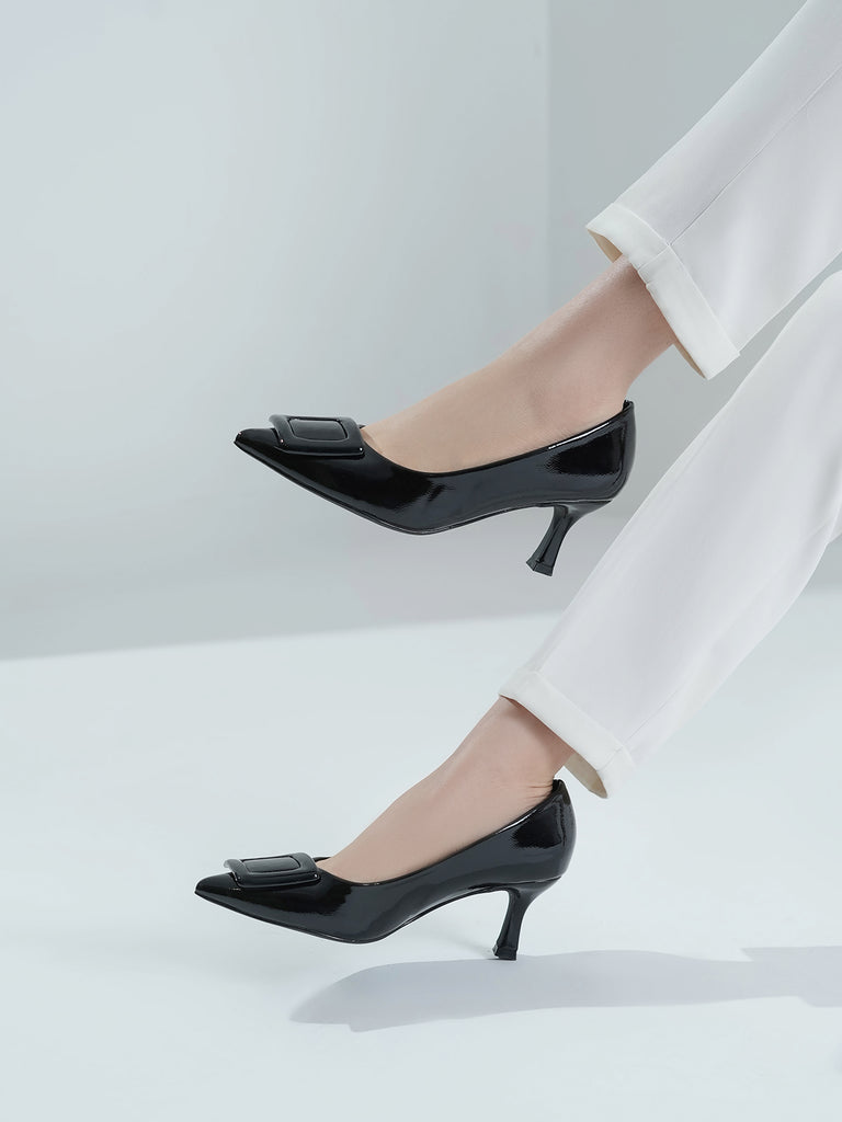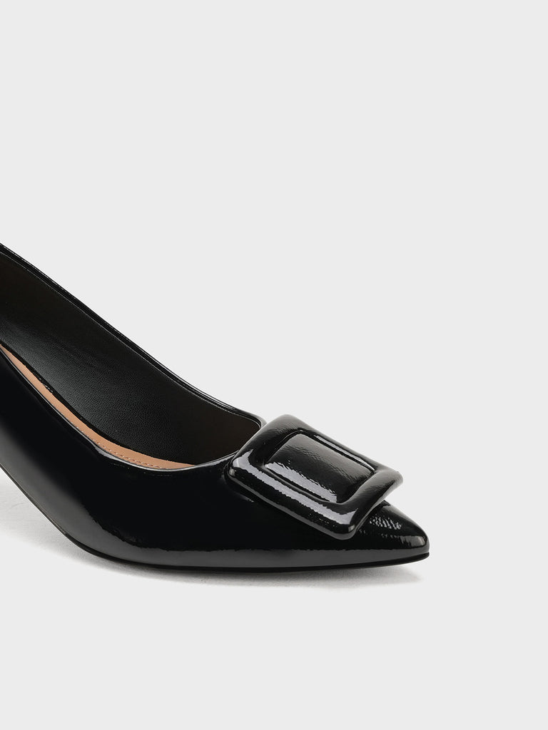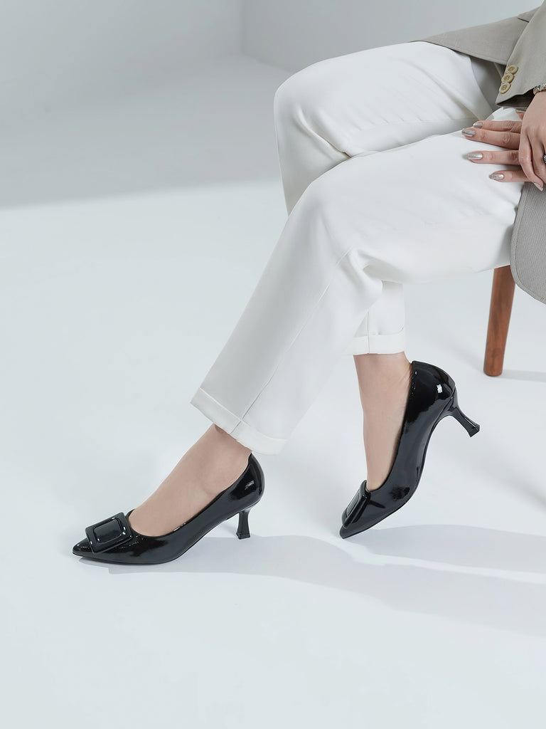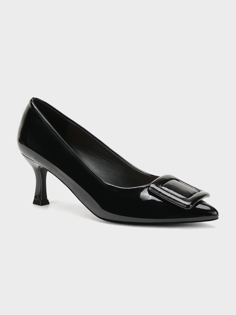 Add a touch of shine to your look with this elegant patent leather court shoe set. Featuring a pointed toe and kitten heel, the black pair stands out with a bold buckle detail,