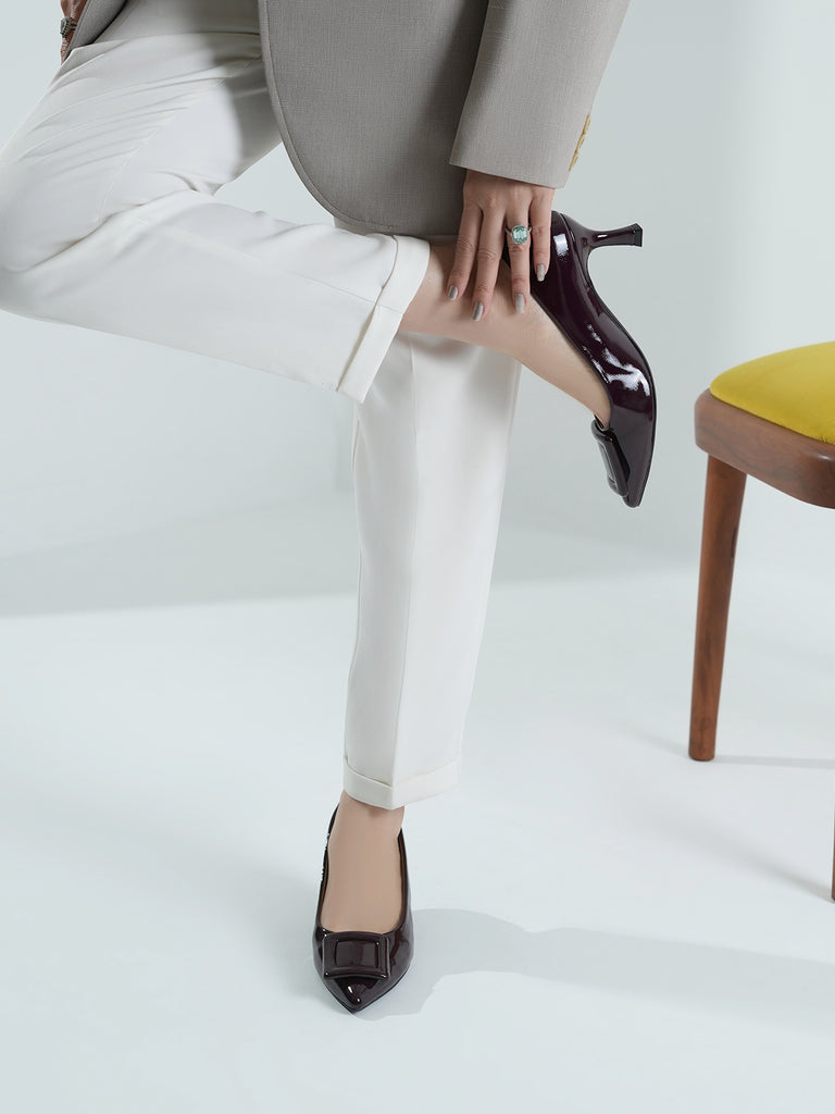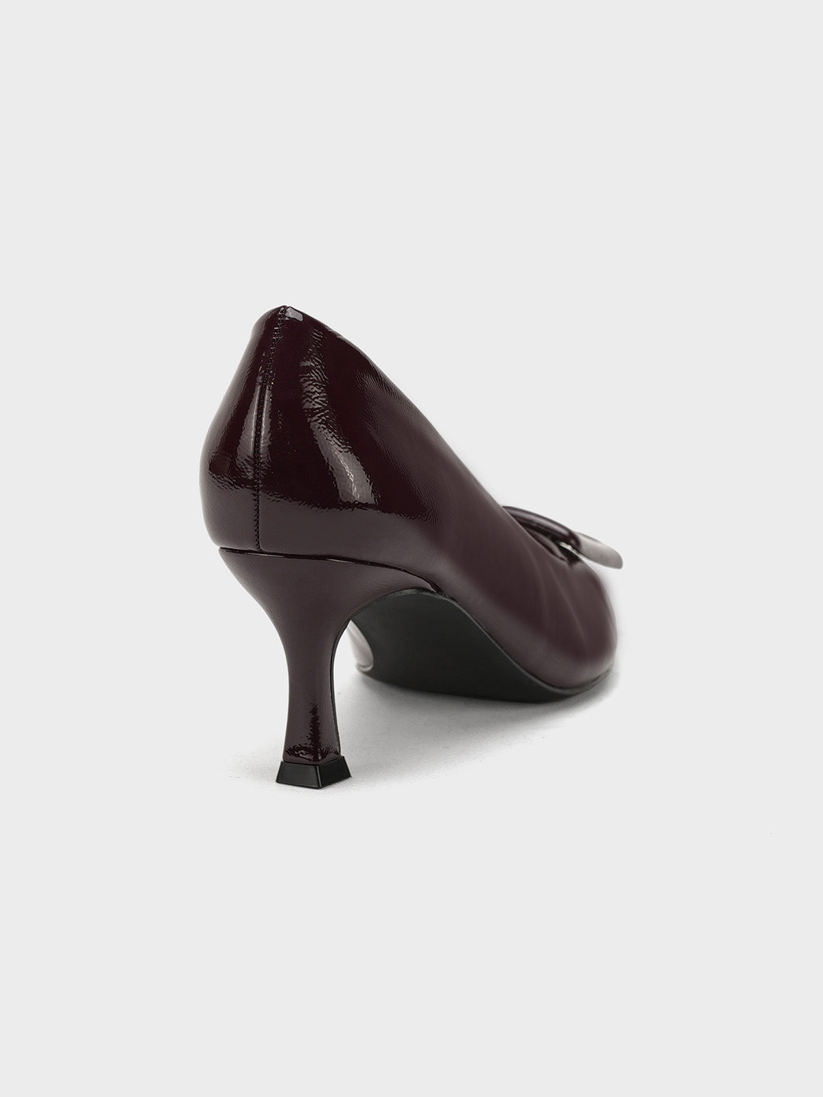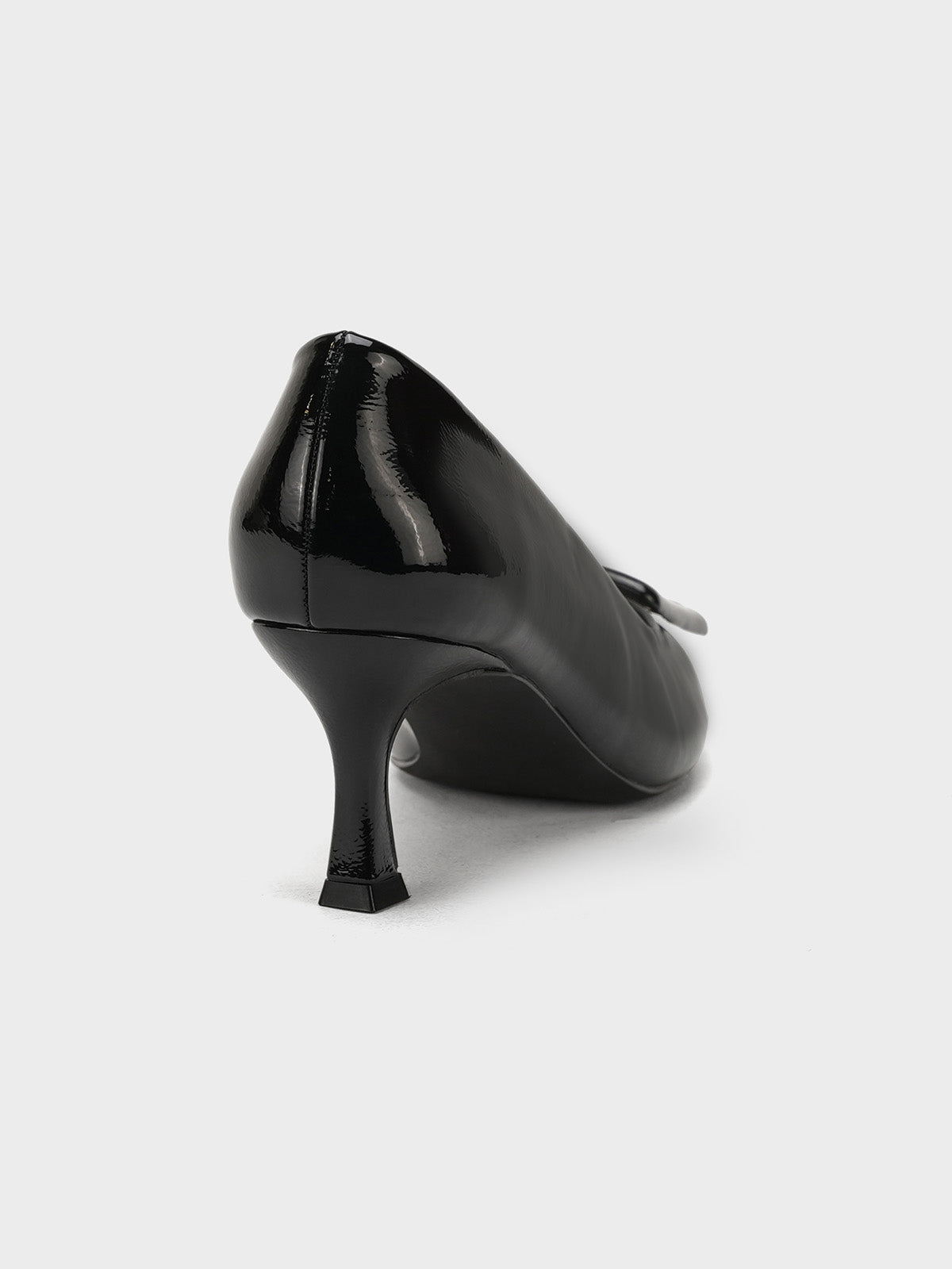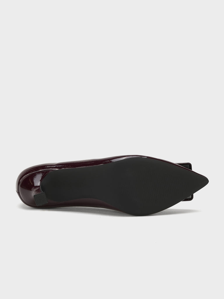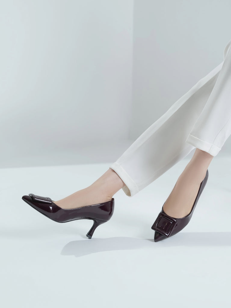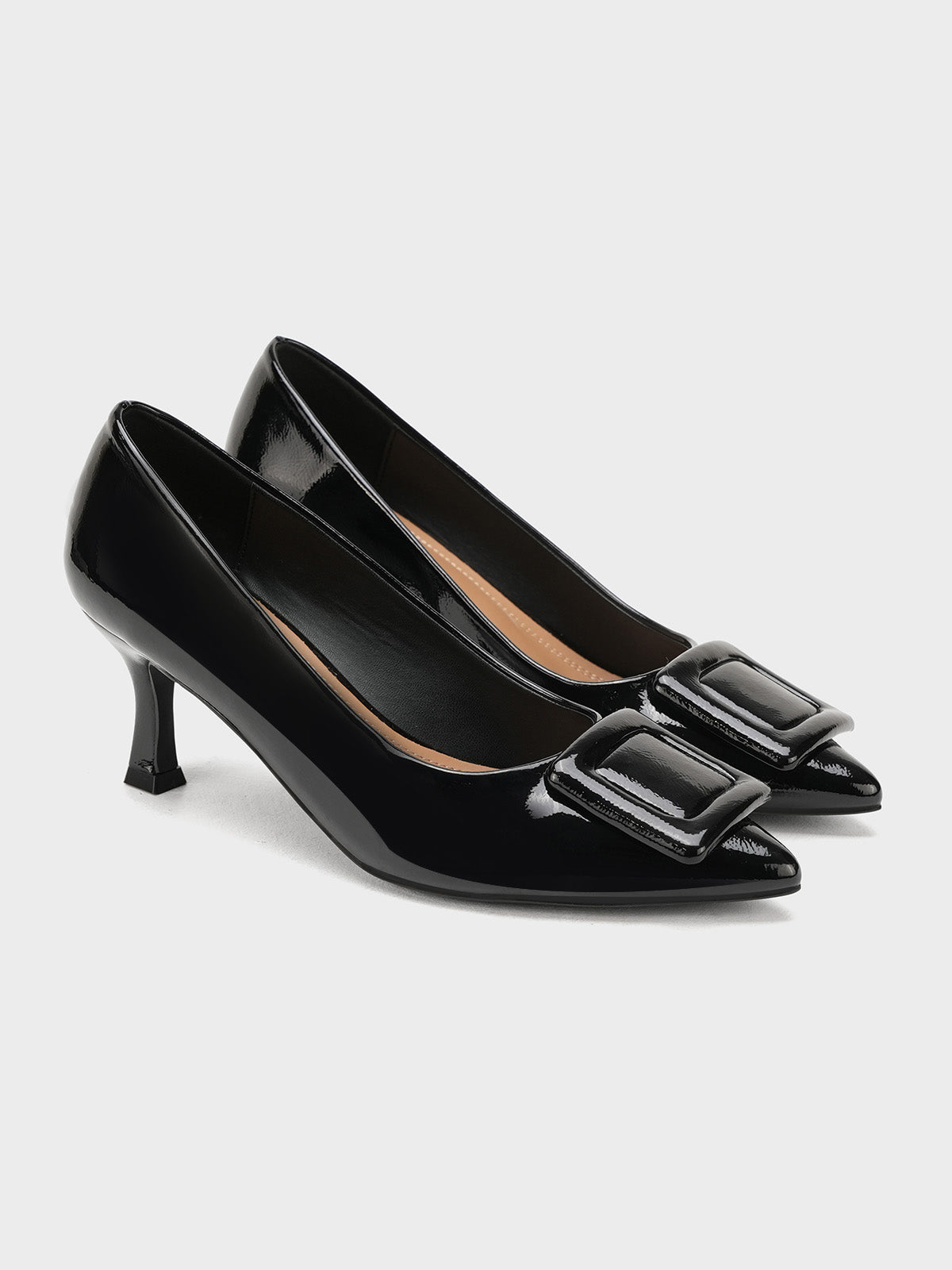 Add a touch of shine to your look with this elegant patent leather court shoe set. Featuring a pointed toe and kitten heel, the black pair stands out with a bold buckle detail,