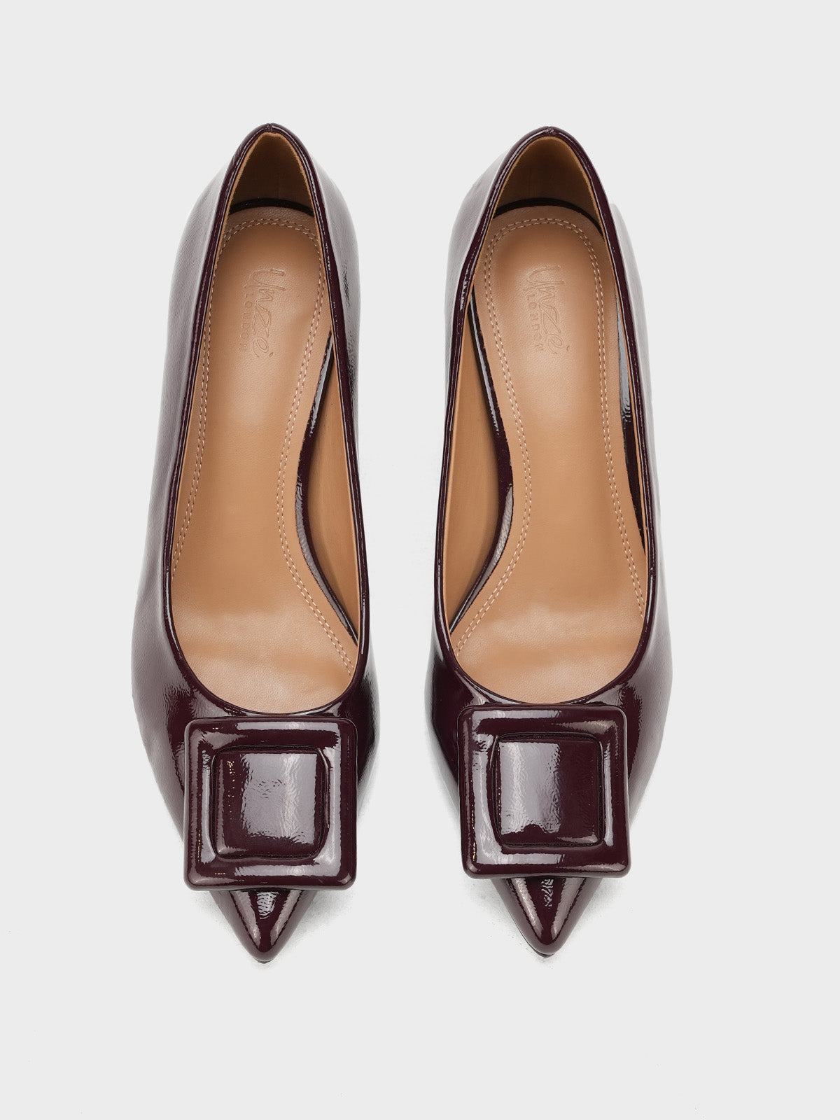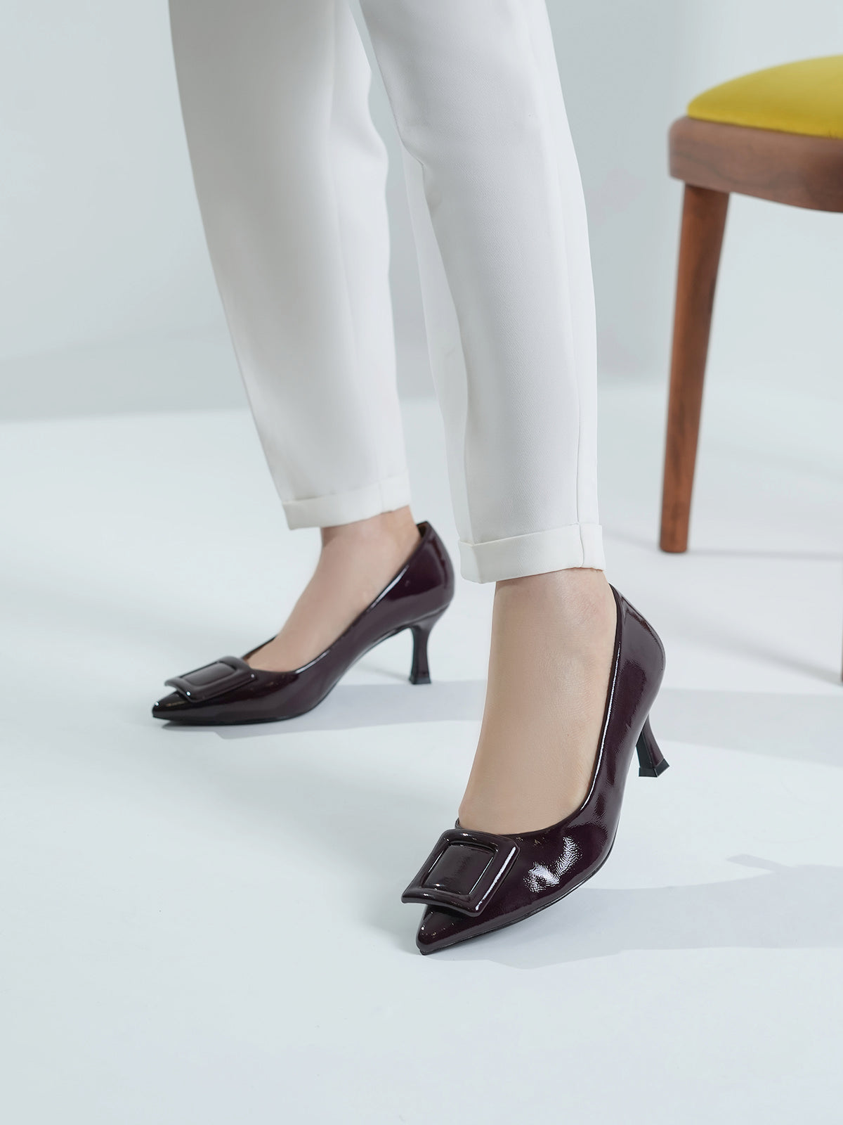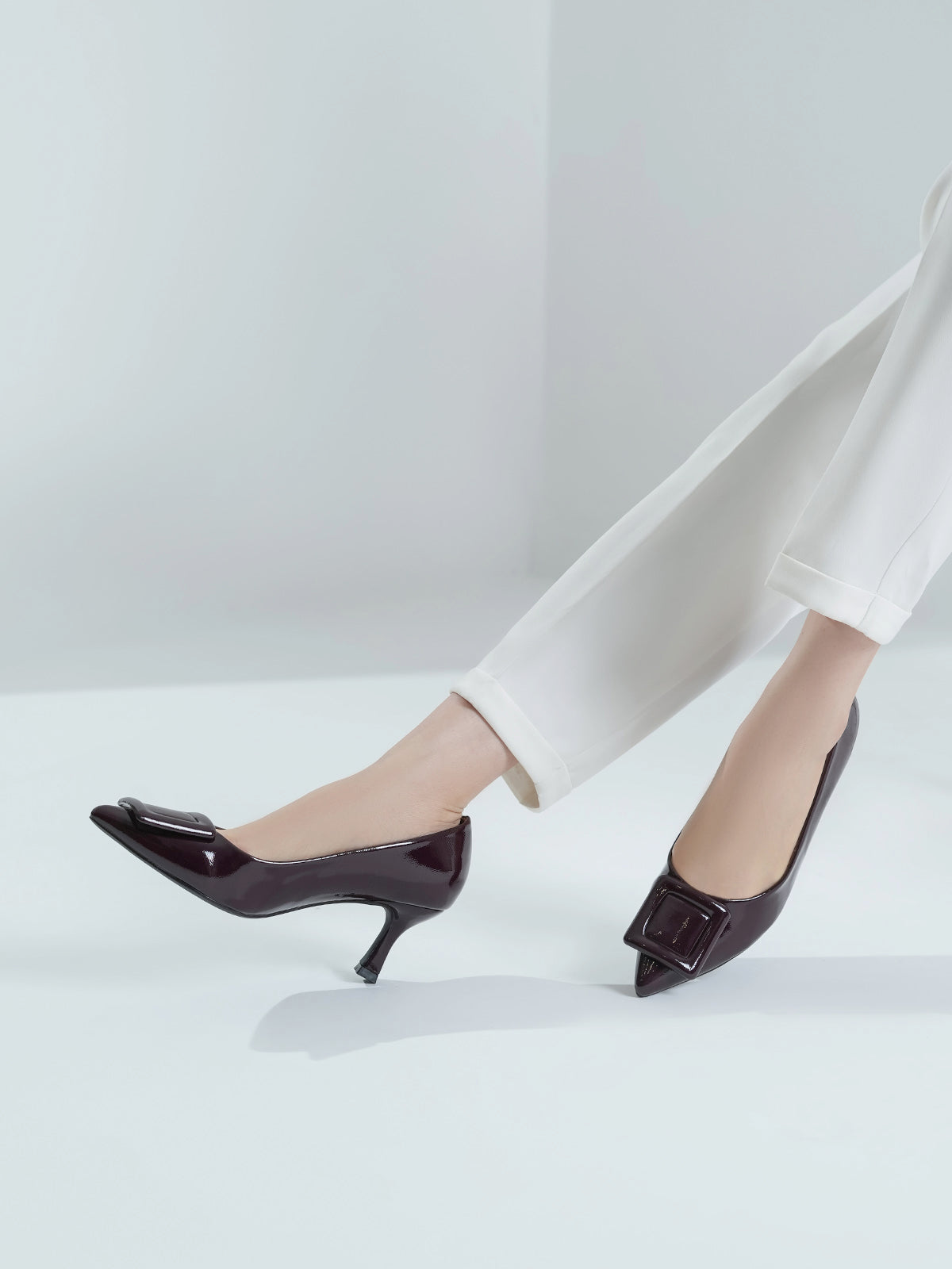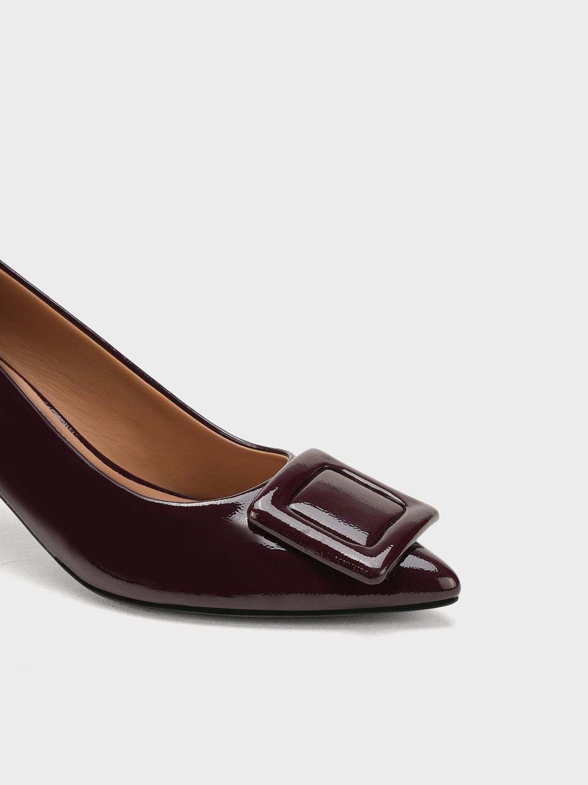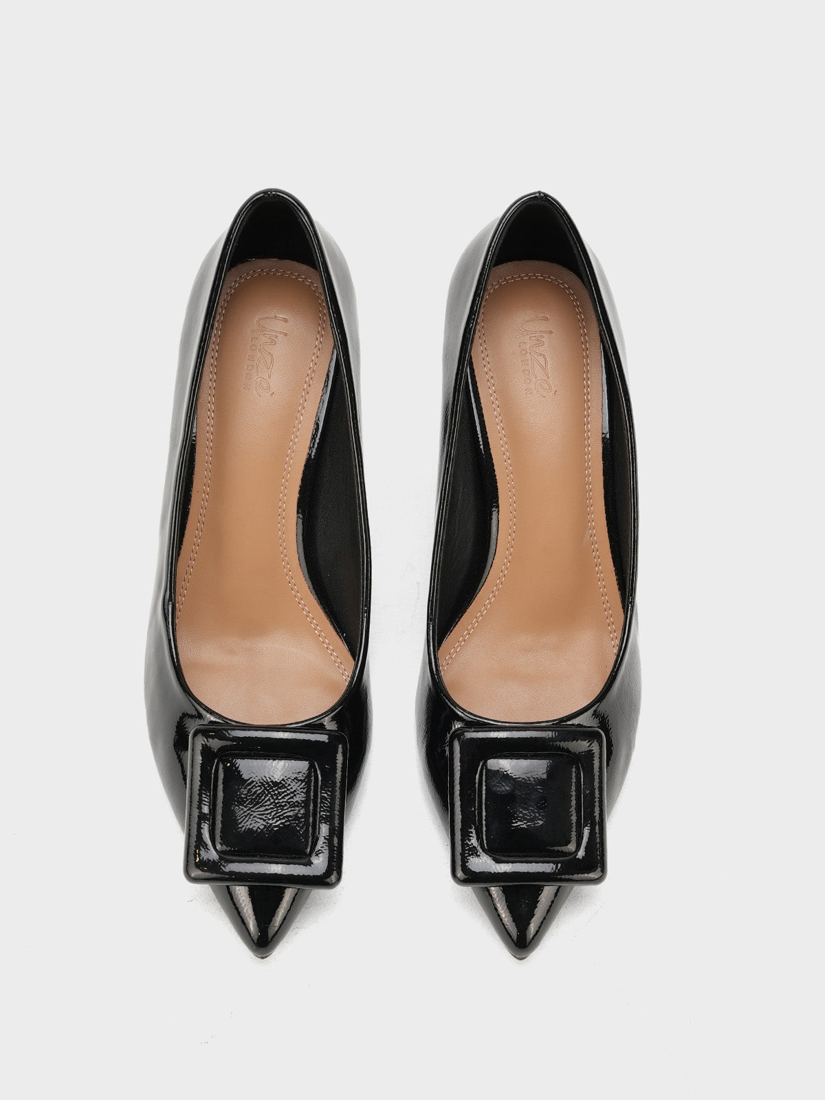 Add a touch of shine to your look with this elegant patent leather court shoe set. Featuring a pointed toe and kitten heel, the black pair stands out with a bold buckle detail,