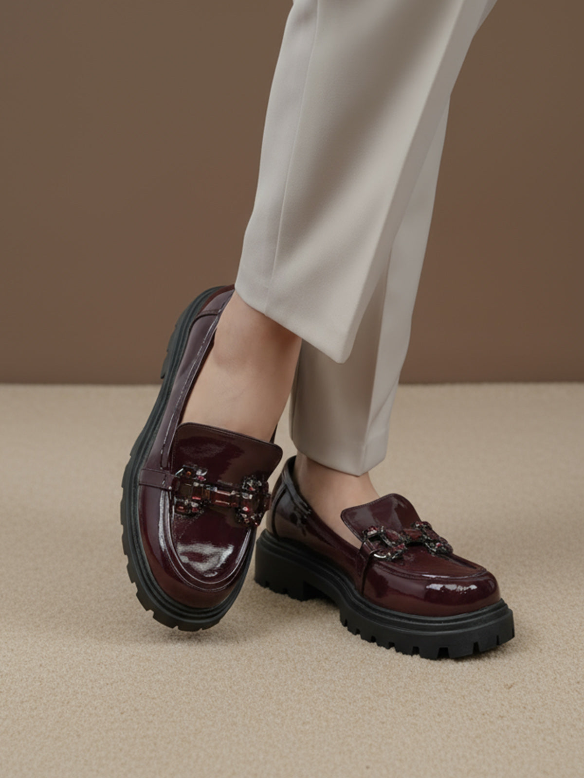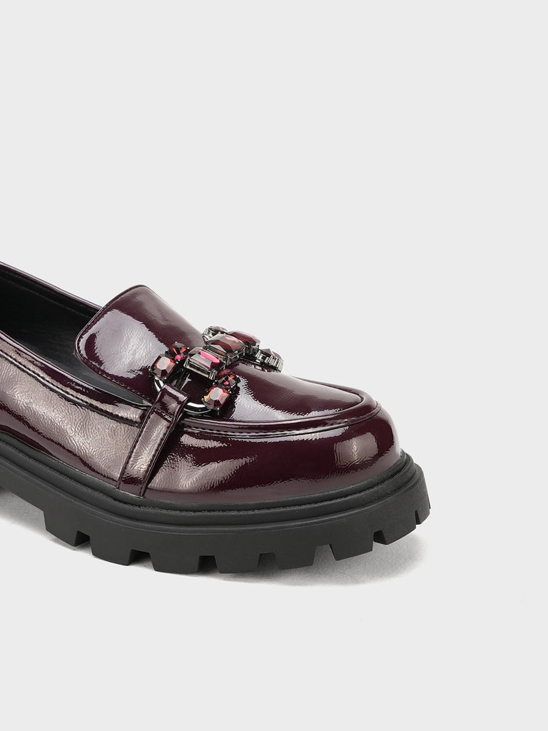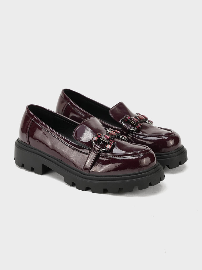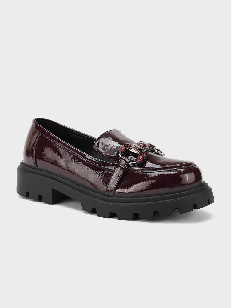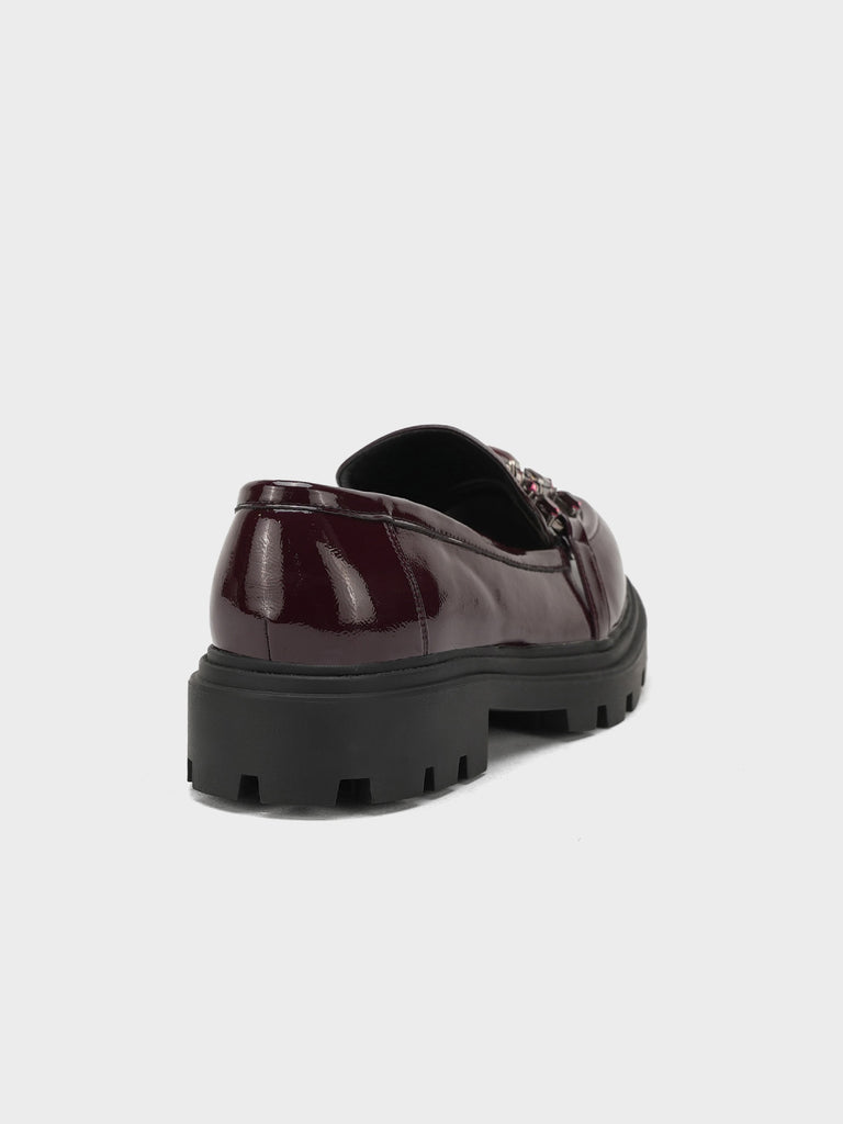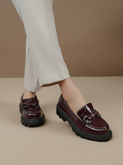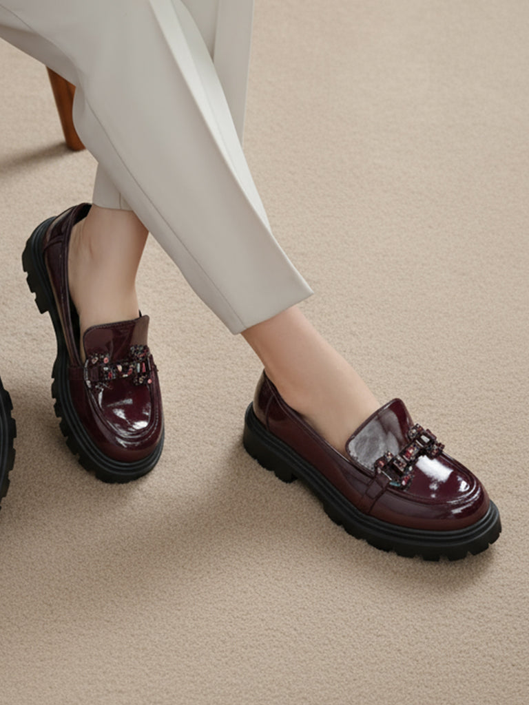 Add a bold touch to your wardrobe with these latest women’s loafers. Designed with a shiny finish, sturdy platform sole, and stylish buckle detail, these loafers offer both comfort and modern flair.