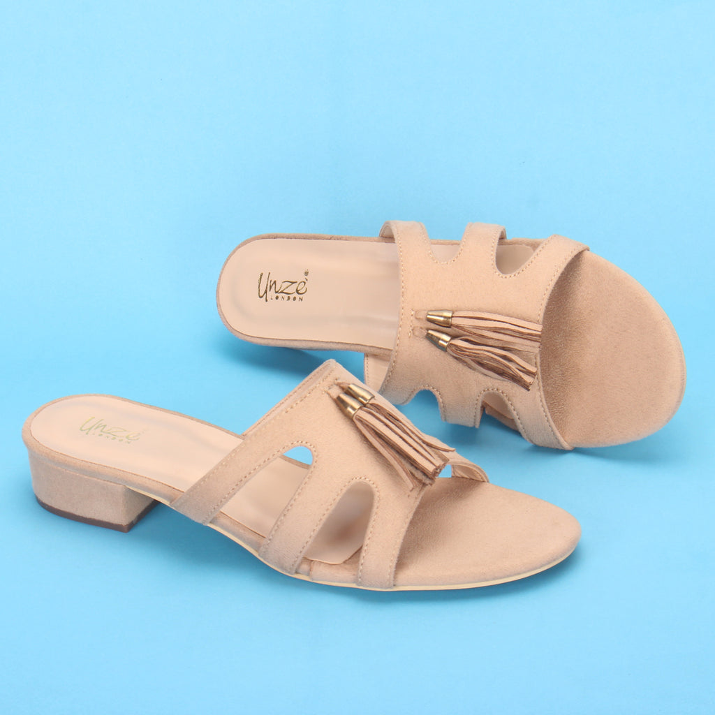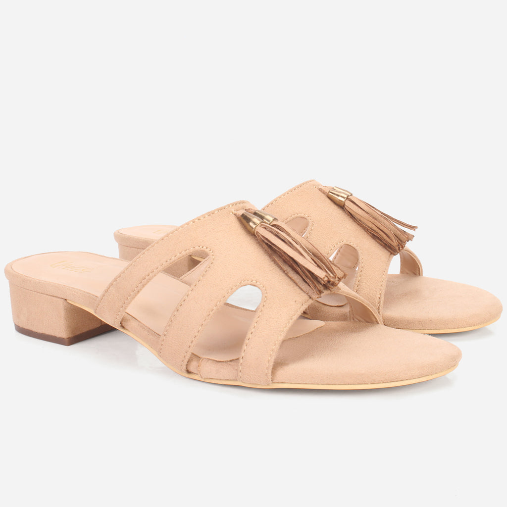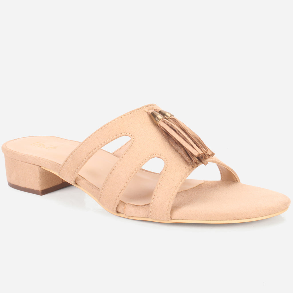 Prepare yourself for those warm weathers vibes with these stylish and comfy summer slippers. This natural, adaptable slide is sure to become a favorite. Convenient slip on style comes for quick on and off. Mid low heel comes along with cushioned footbed and open toe silhouette. Upper is beautifully adorned with trim detailing that makes it more versatile. Suede upper, PU lining and rubber sole makes these slid-in shoes perfect for warm weather.