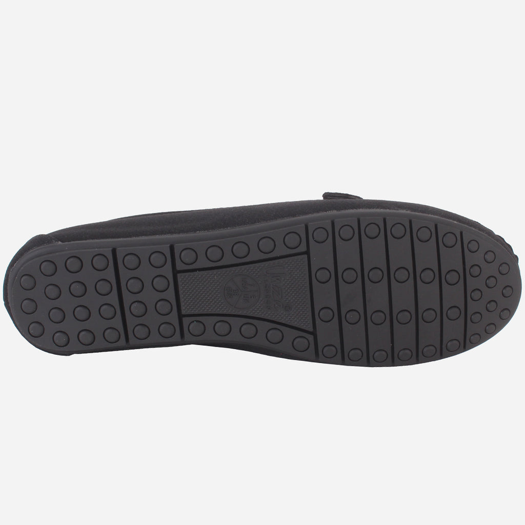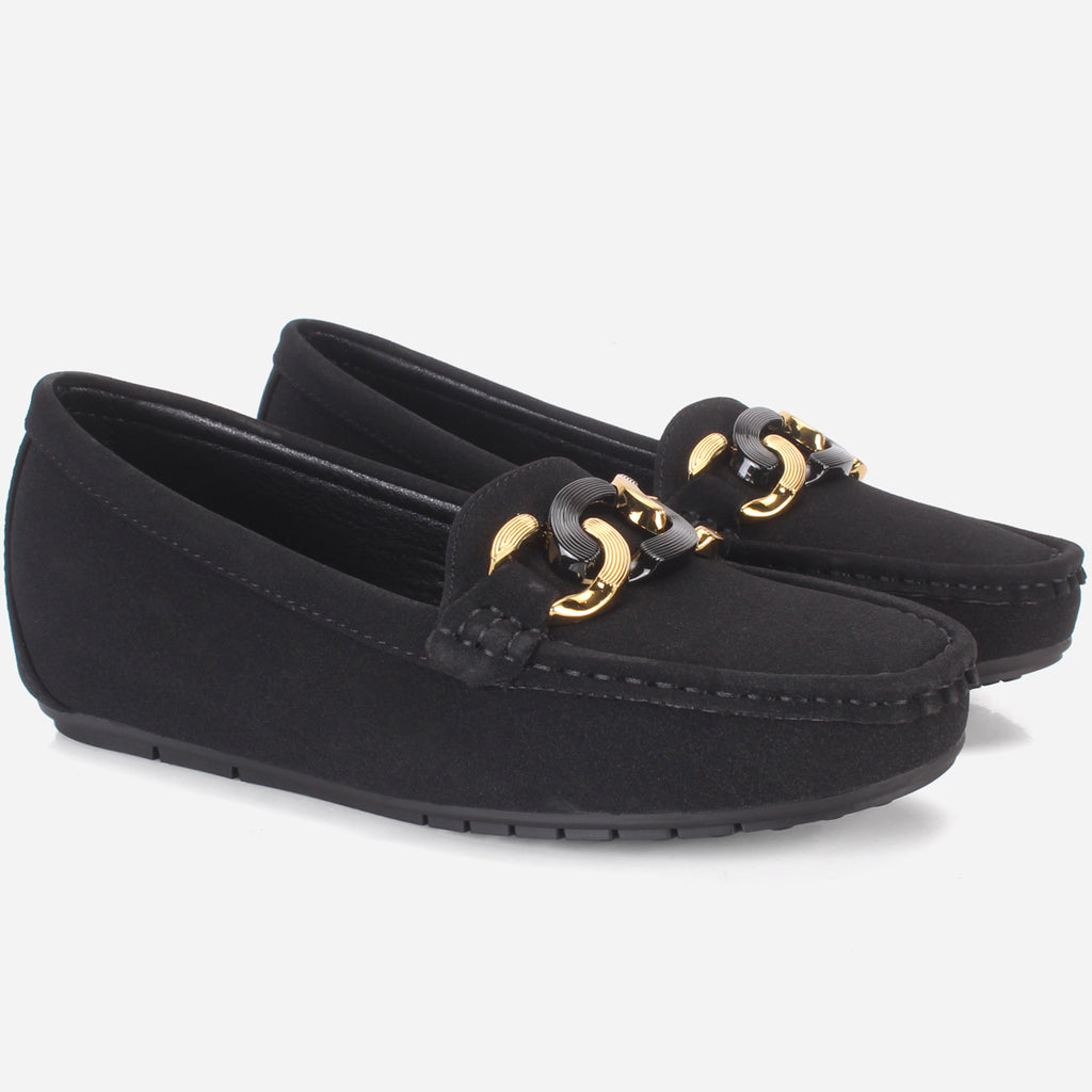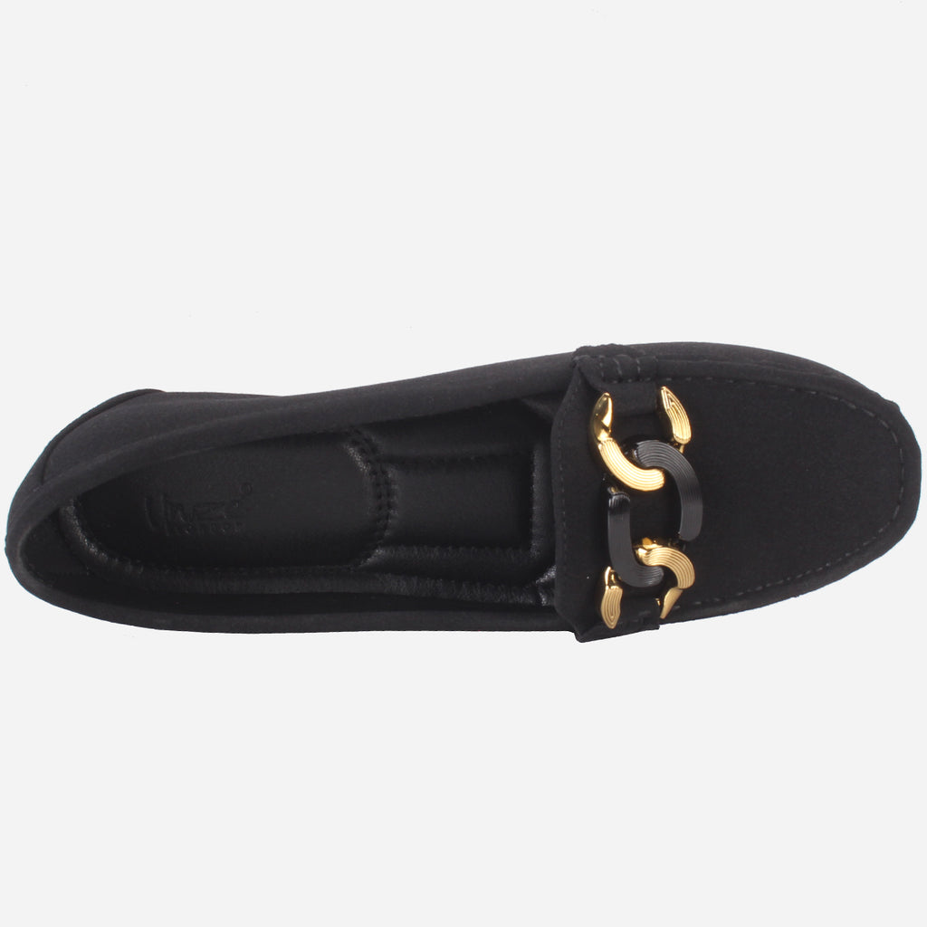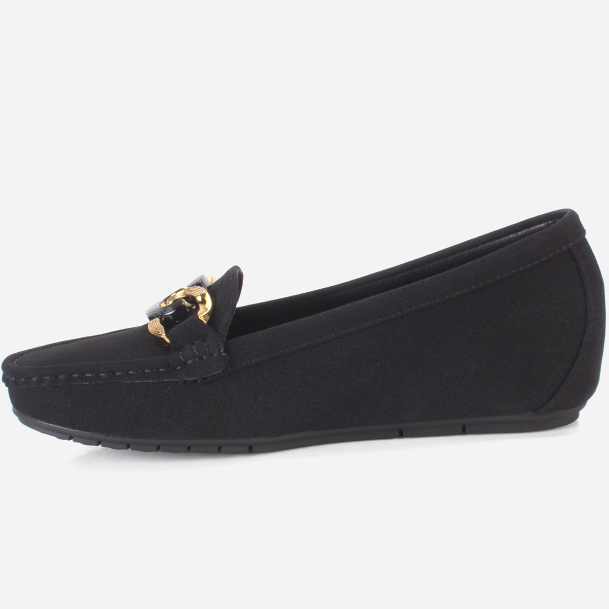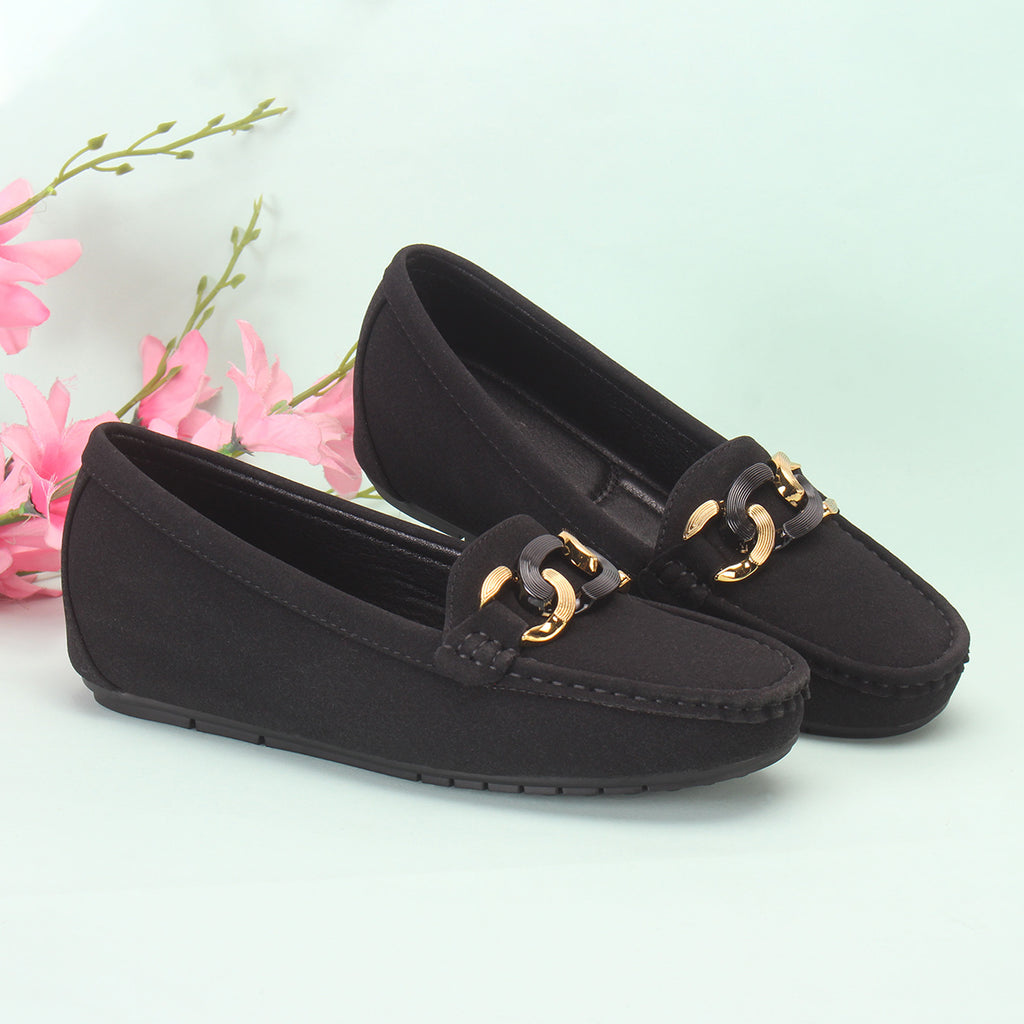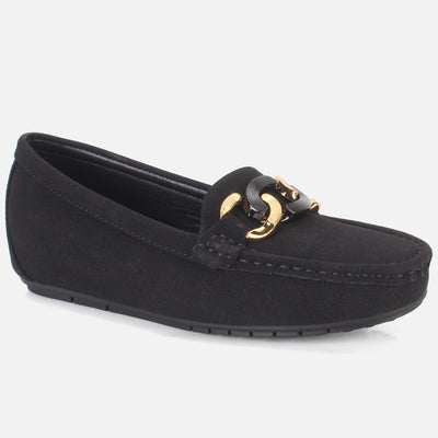 Introducing a distinctive style that effortlessly sets you apart from the crowd while ensuring your utmost comfort. These shoes feature a fashionable metallic buckle ornament on the vamp, complemented by side stitched detailing, enhancing their overall stylish appeal with a textured design throughout. The convenient slip-on design boasts a round toe and padded-in socks, guaranteeing unparalleled comfort.