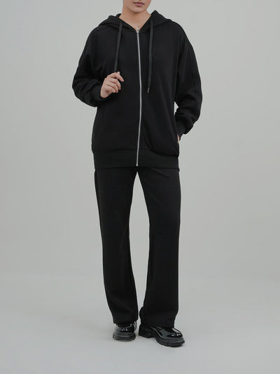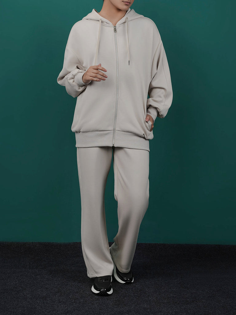 This women's fleece co-ord set is perfect for a cozy, casual look. It comes with a zip-up hoodie and matching pants with zip detail at the bottom. Made from soft fabric, it's great for everyday wear and staying warm.