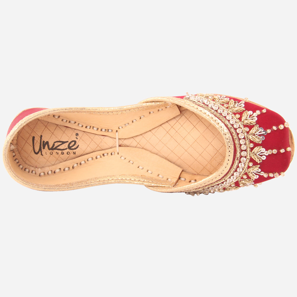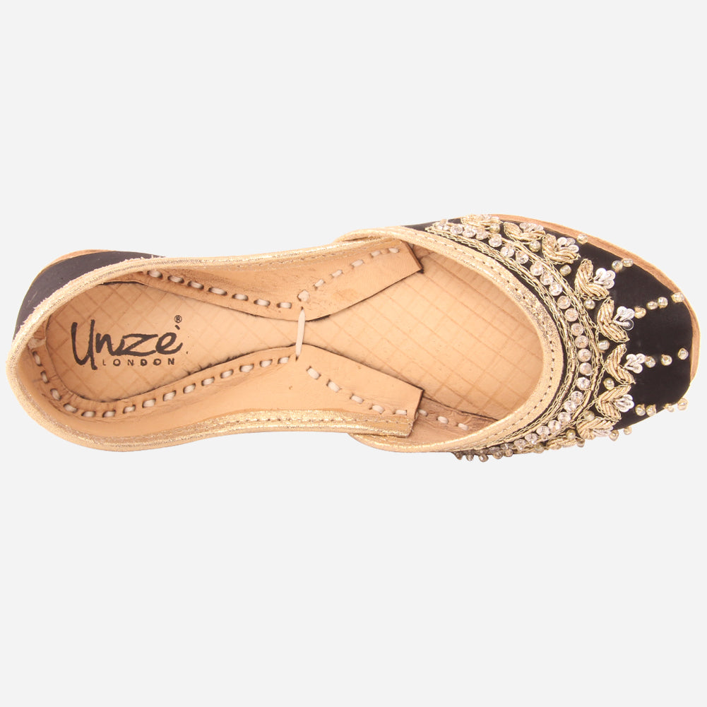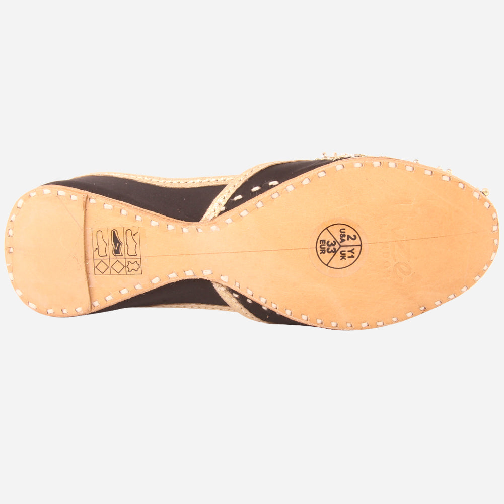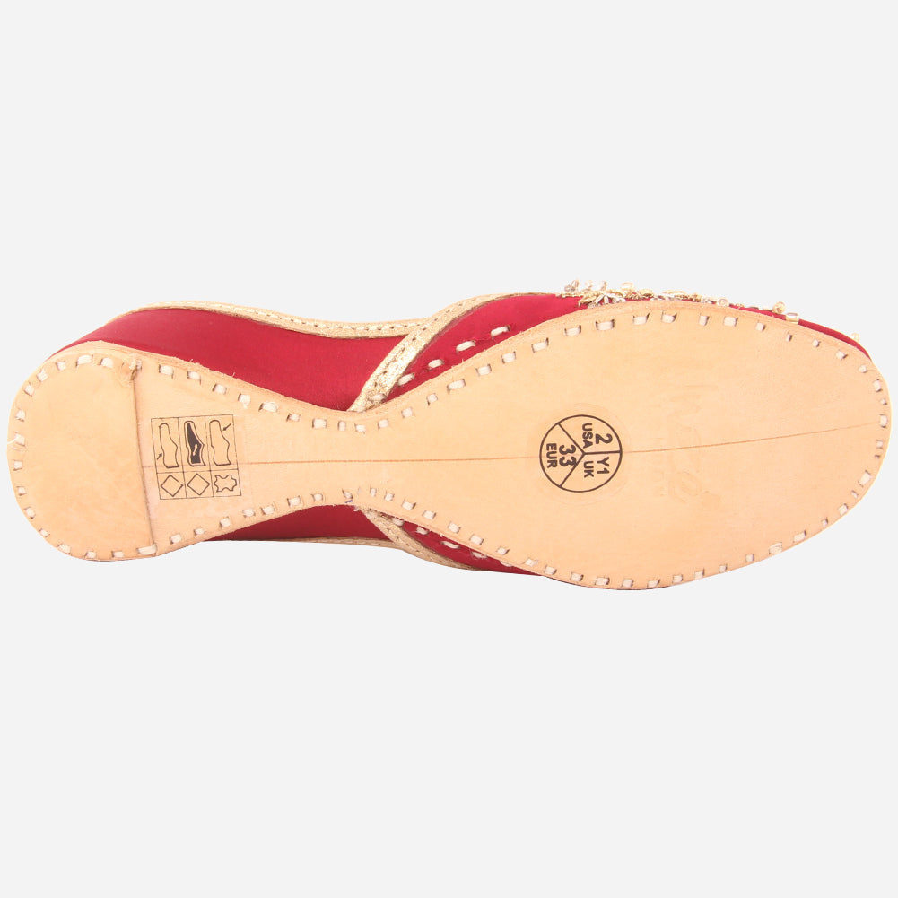 These stylish ballet style flat Indian Khussa is always best choice from day wear to evening out. Fully embellished and embroidered upper that is made of leather. Easy slip on construction is for quick on and off. Handcrafted and hand made these pumps are genuine leather made with inside stitch detailing.