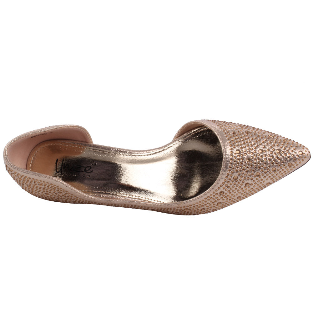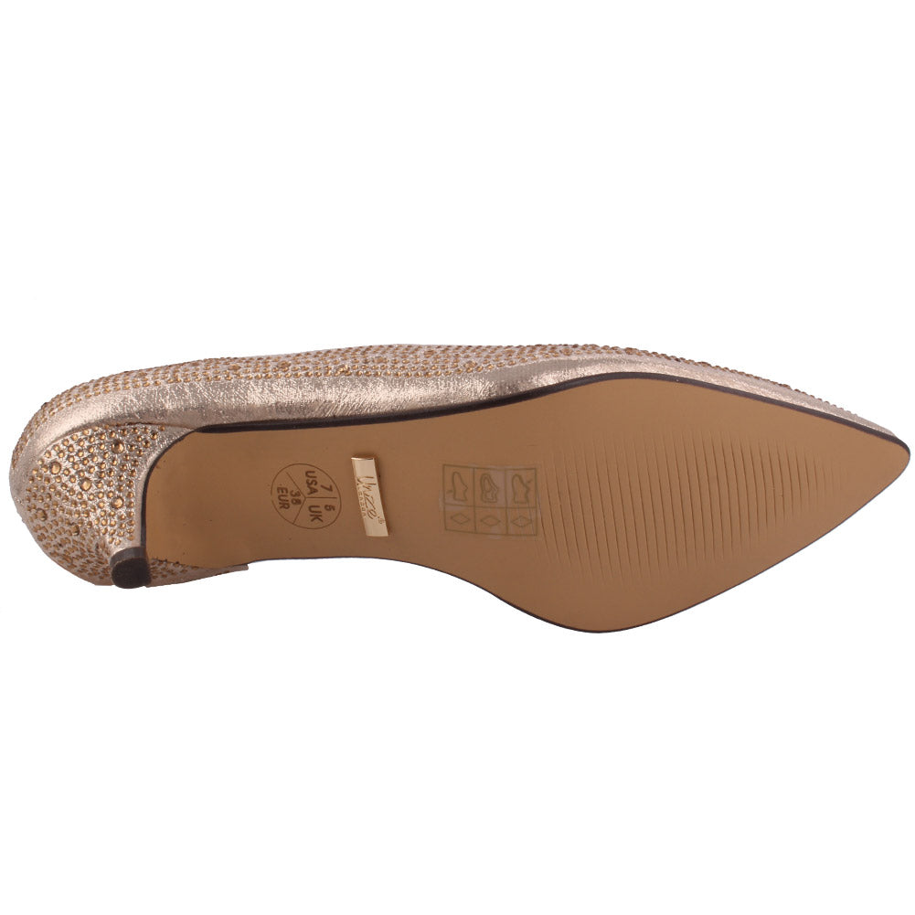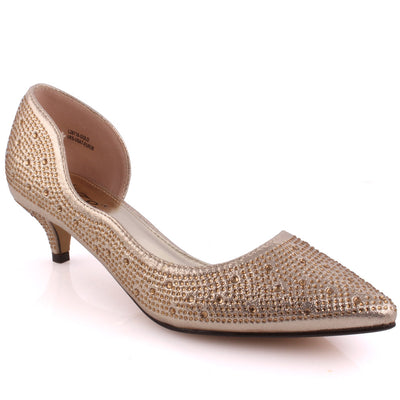 Double the charm of evening with these chic low heeled stylish court shoes. These evening court shoes have pointy toe with rhinestone detailing all over. Easy slip on construction for quick on and off.PU made upper, sole and lining makes it more comfortable. These prom court shoes has low kitten heel to walk on. Lightly padded footbed adds comfort to them.