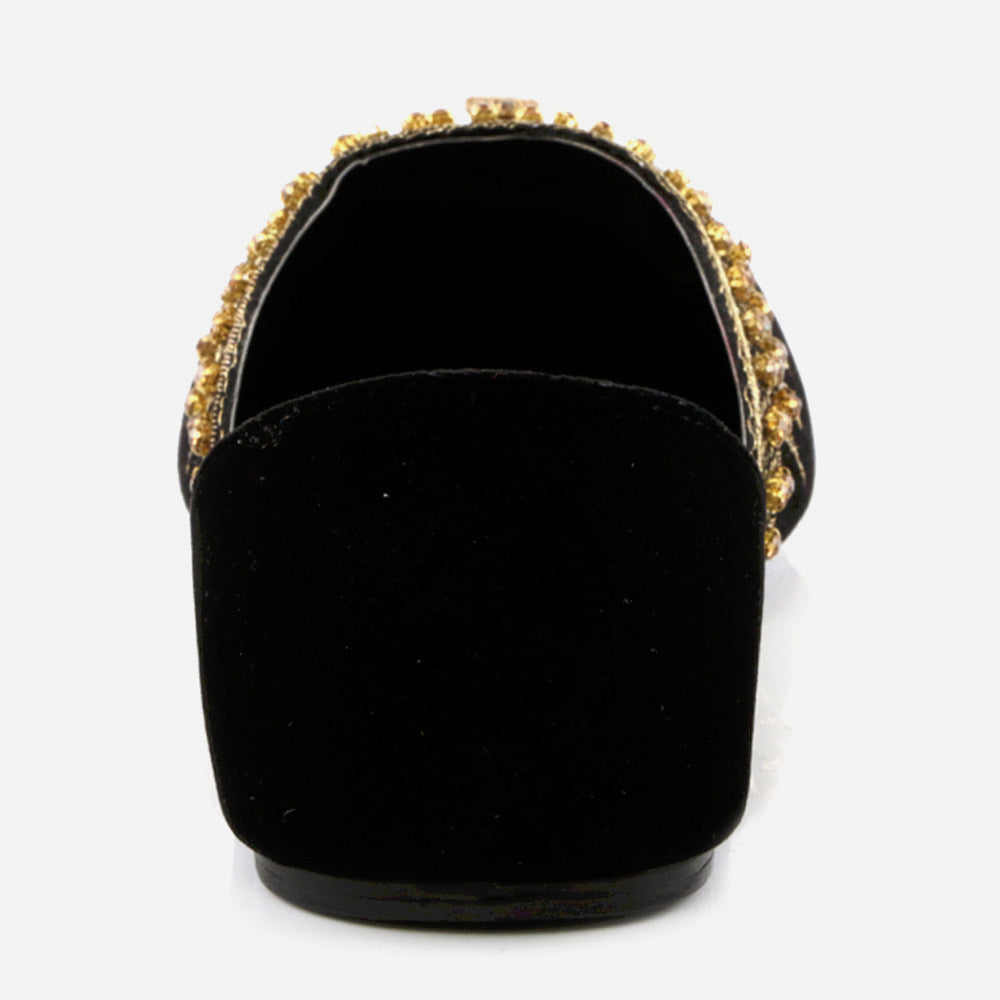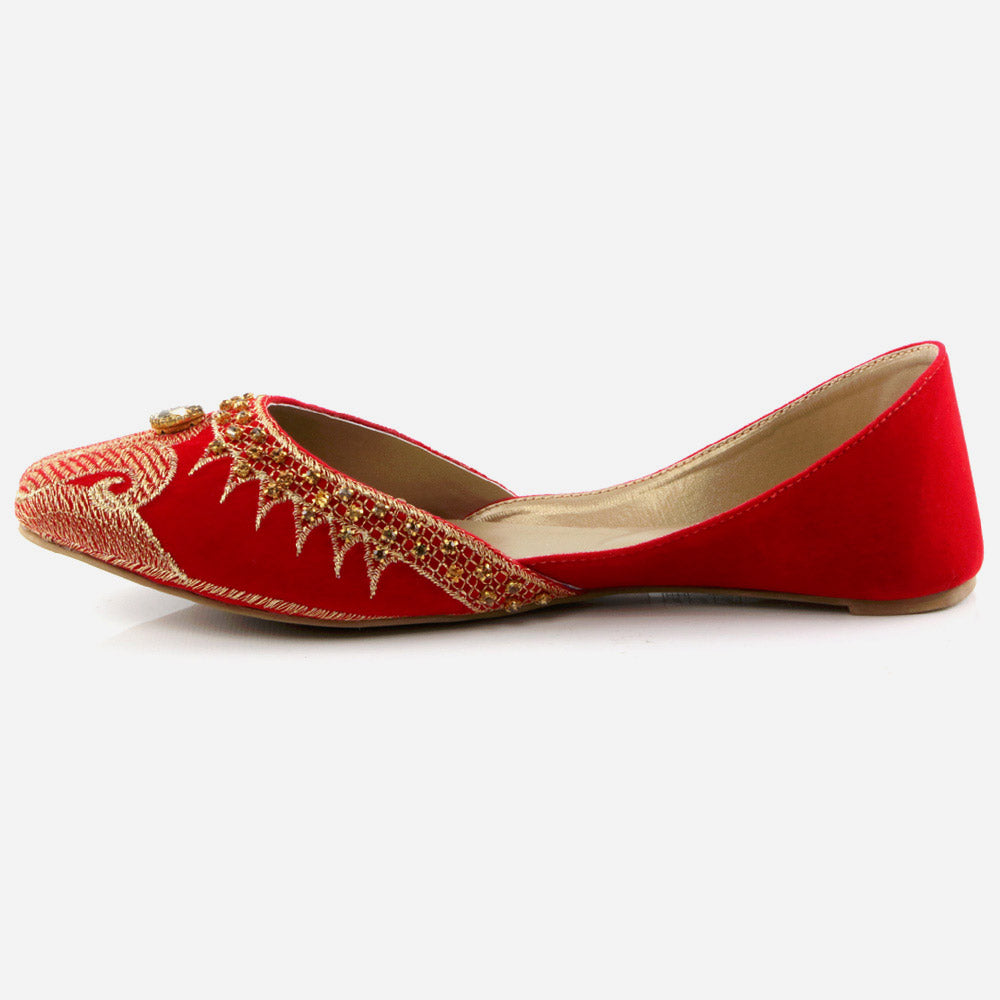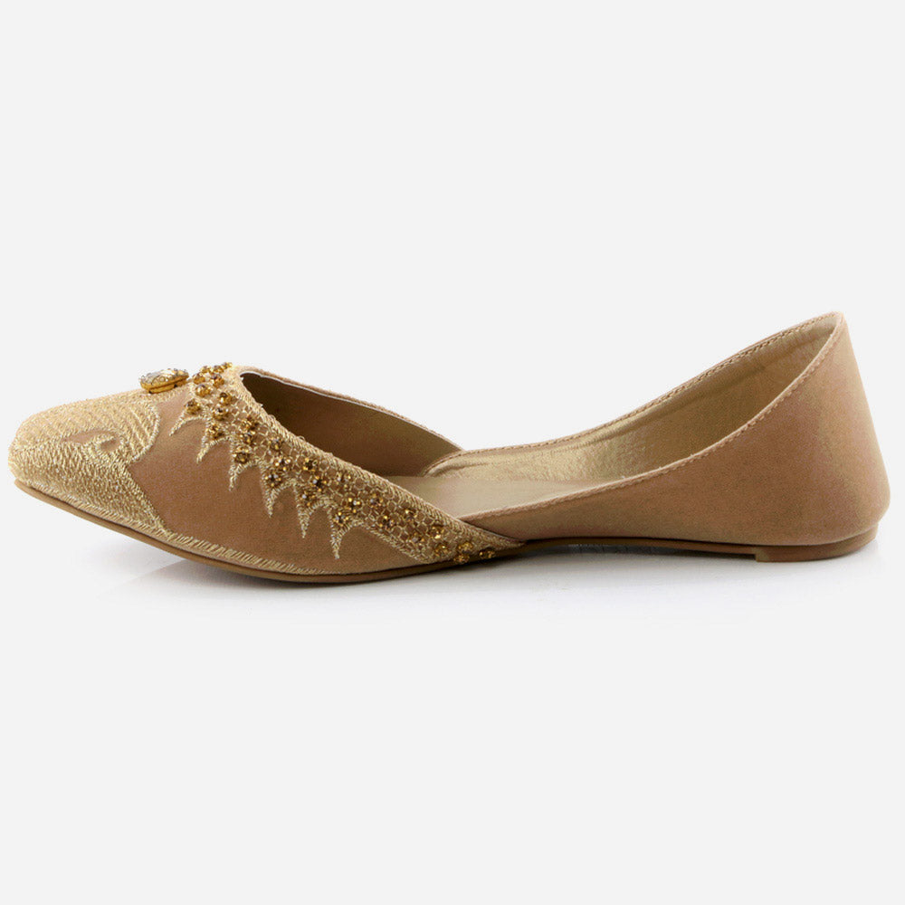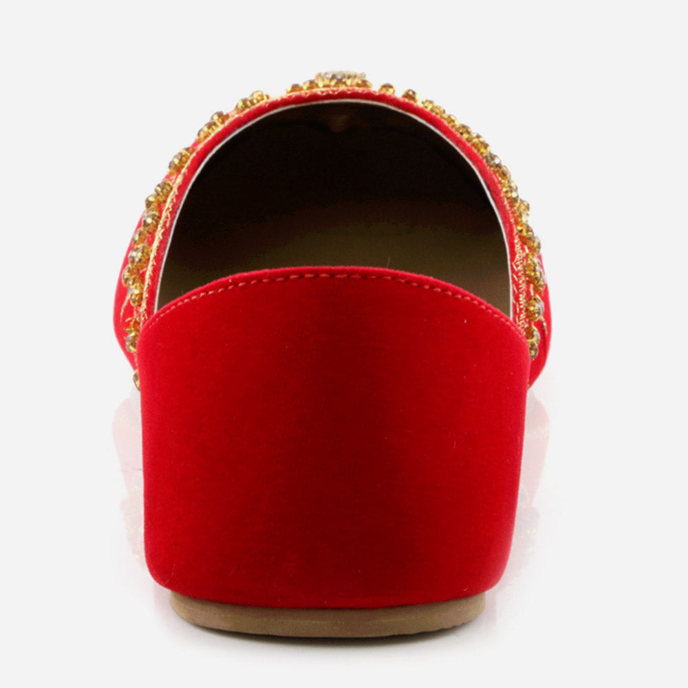 Conjure a melodious starry night with these Rhinestone embellished Shalimar Shoes Indian Flat Leather Khussa. This year our new Indian Khussa collection is fully decorated. The fully diamante upper puts shimmer and shine in each step while the silhouette is simple, slender and perfectly sweet. These shoes are truly stylish piece made by expert craftsman. It’s beautifully embellished with pearls and crystals to give formal look. And padded in-socks add comfort in it. These Mojaris can be worn either left or right, doesn’t make any difference.