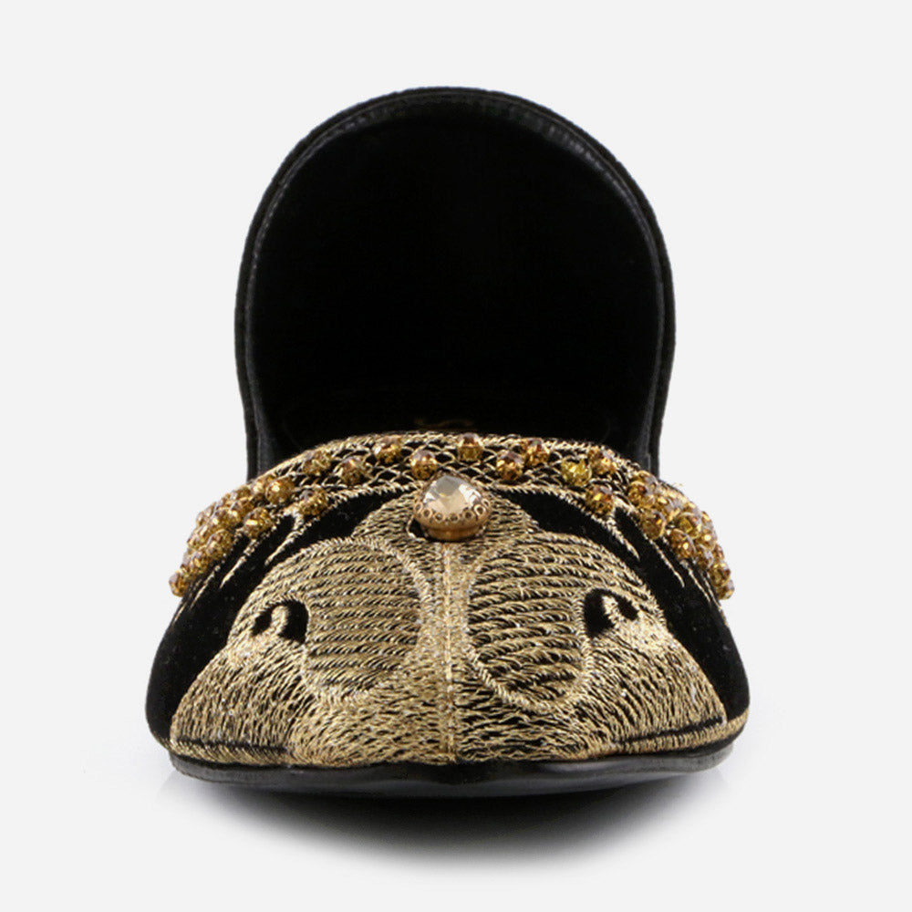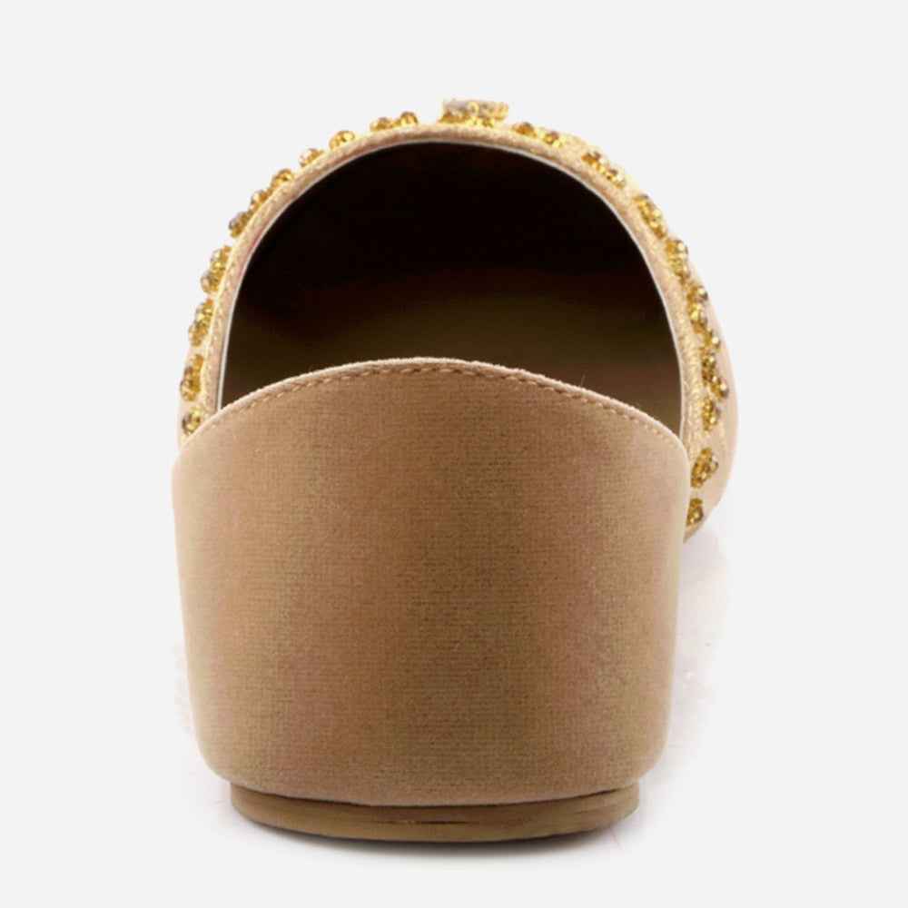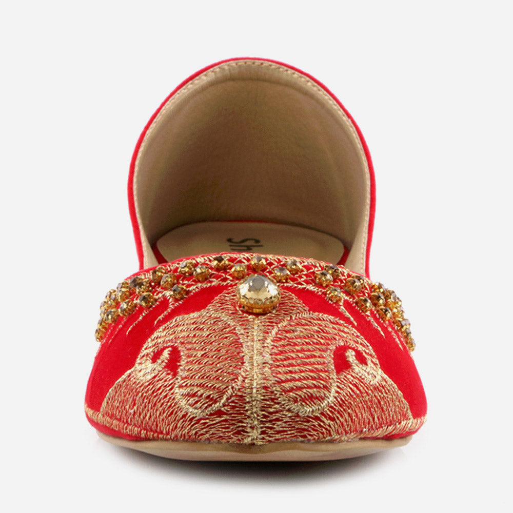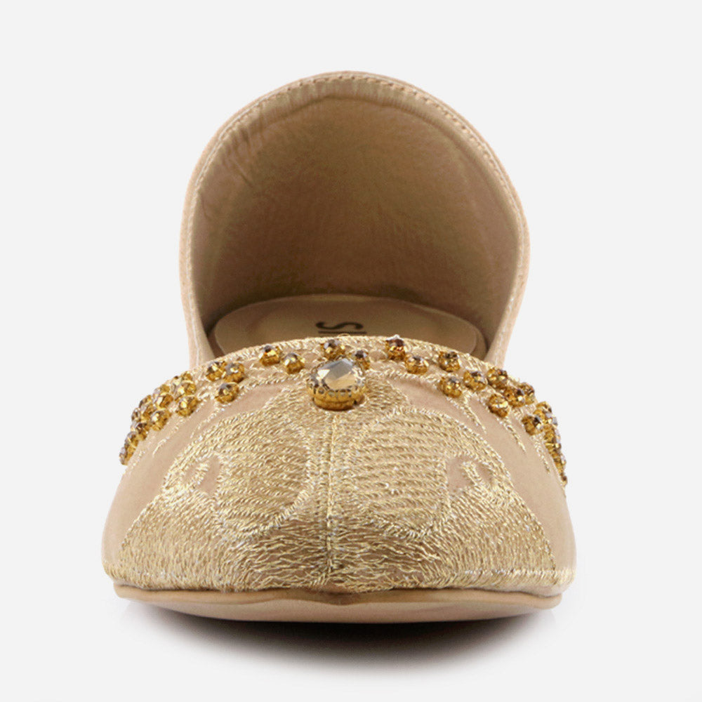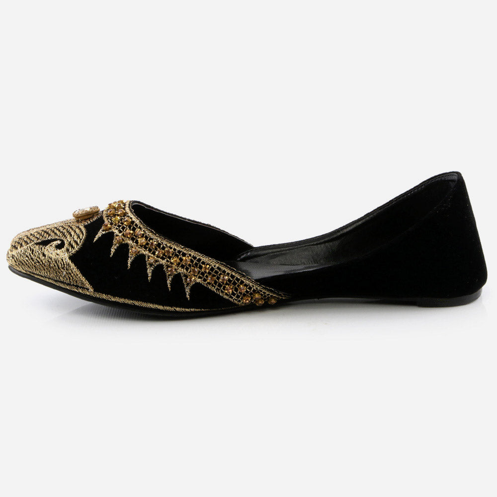 Conjure a melodious starry night with these Rhinestone embellished Shalimar Shoes Indian Flat Leather Khussa. This year our new Indian Khussa collection is fully decorated. The fully diamante upper puts shimmer and shine in each step while the silhouette is simple, slender and perfectly sweet. These shoes are truly stylish piece made by expert craftsman. It’s beautifully embellished with pearls and crystals to give formal look. And padded in-socks add comfort in it. These Mojaris can be worn either left or right, doesn’t make any difference.