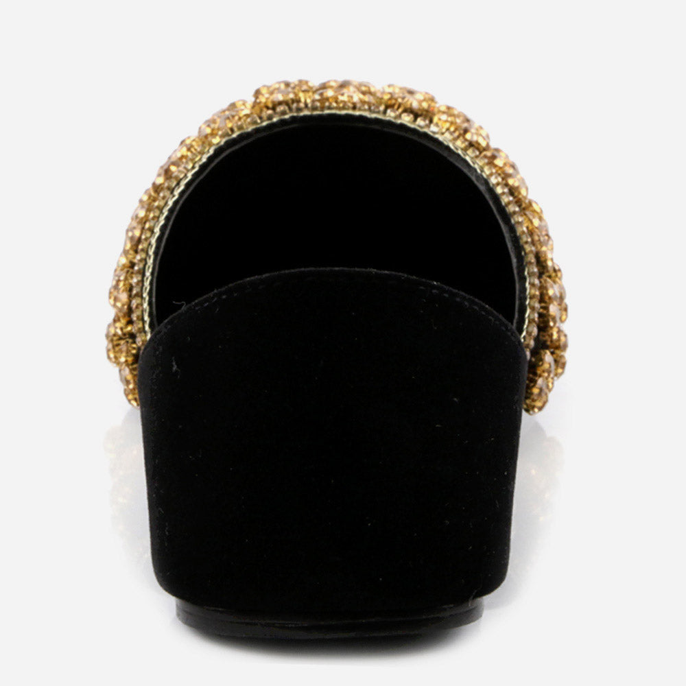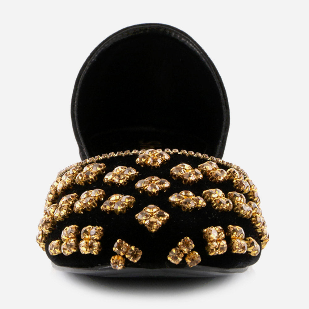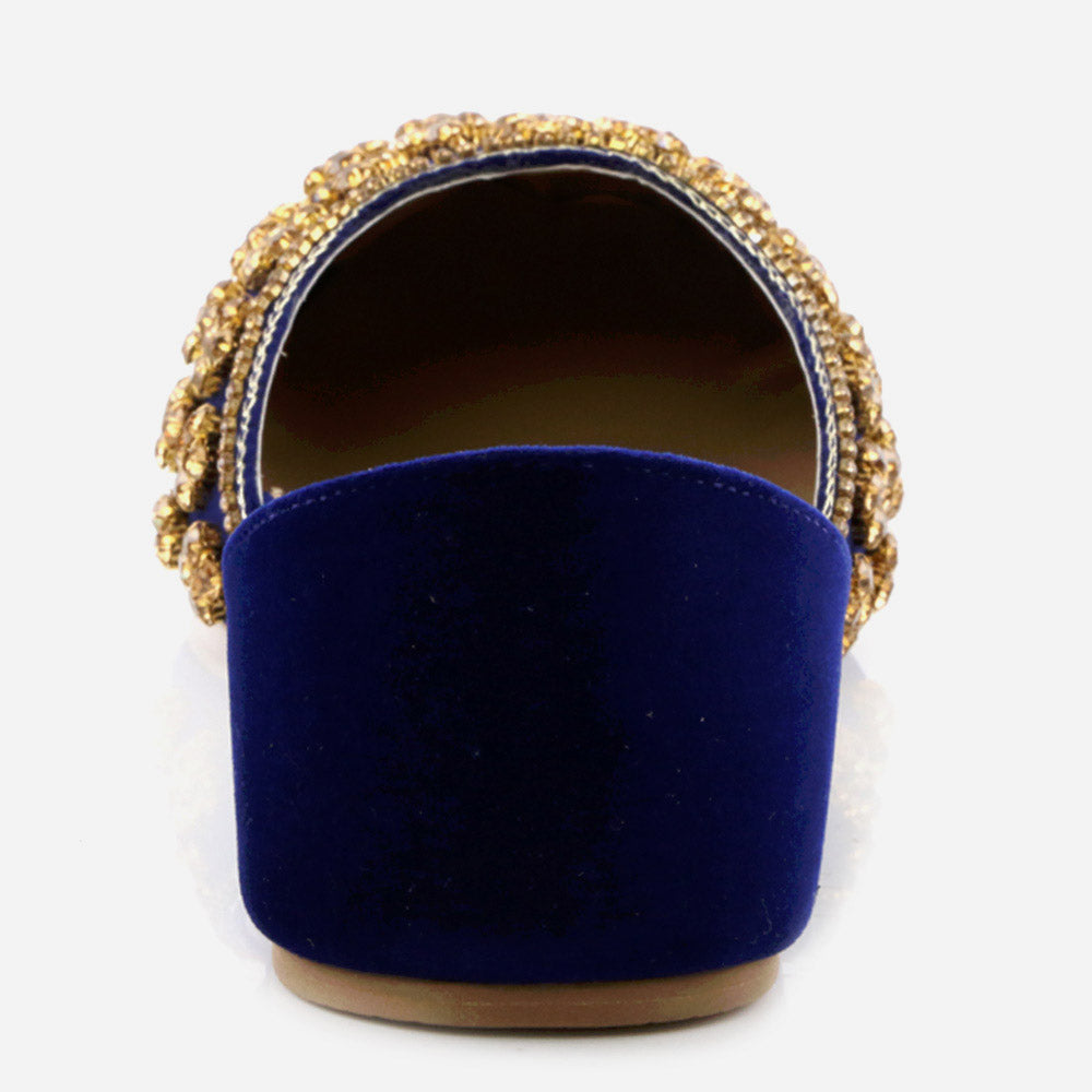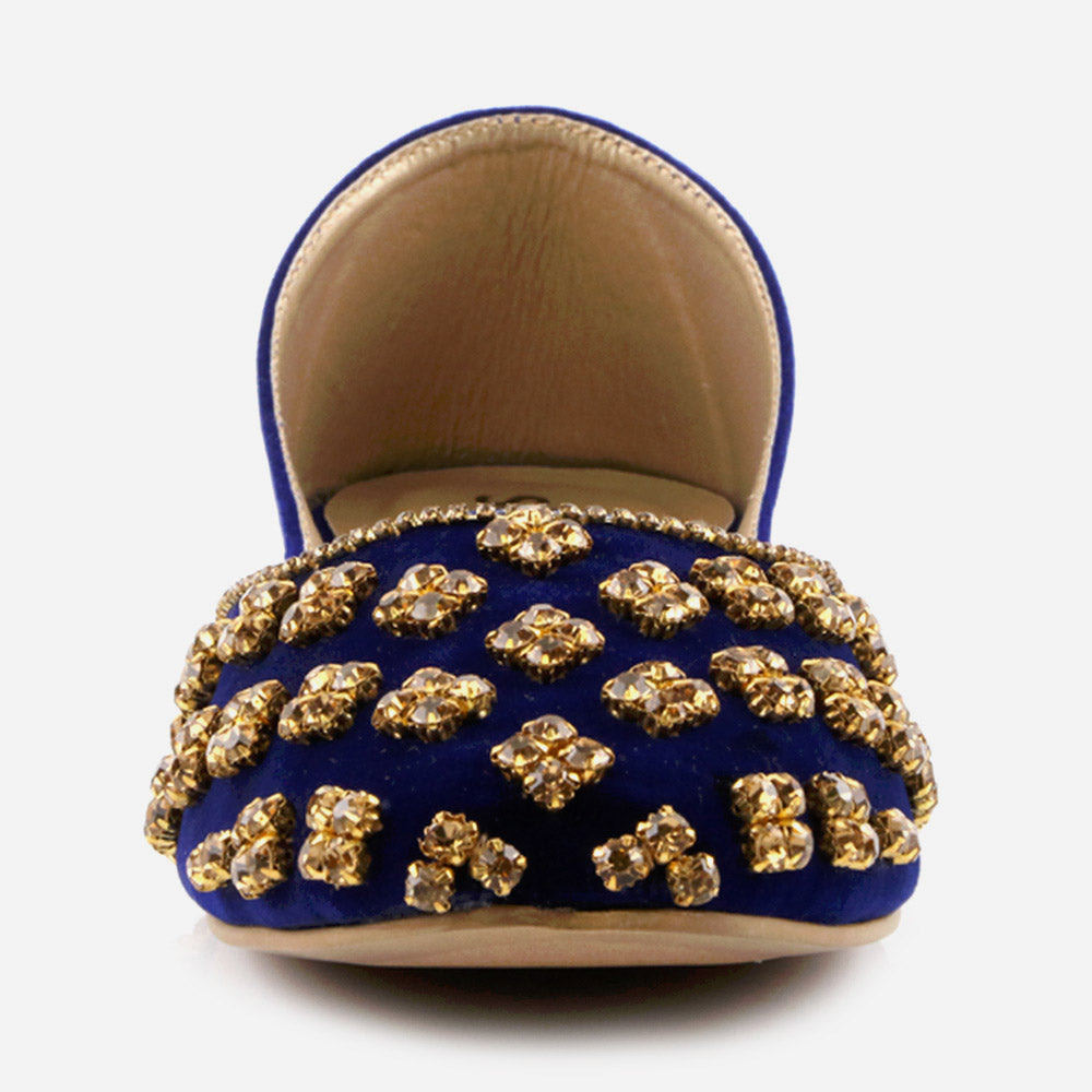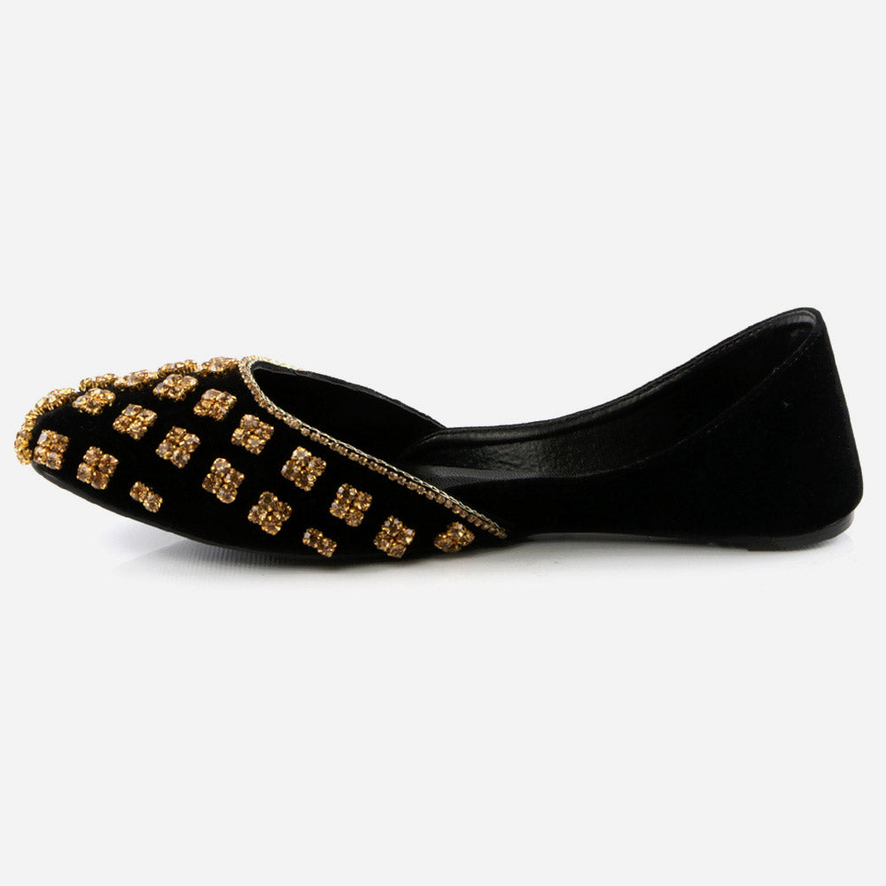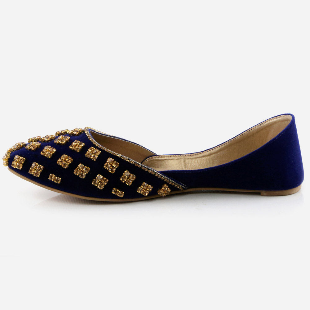Conjure a melodious starry night with these Rhinestone embellished Shalimar Shoes Indian Flat Leather Khussa. This year our new Indian Khussa collection is fully decorated. The fully diamante upper puts shimmer and shine in each step while the silhouette is simple, slender and perfectly sweet. These shoes are truly stylish piece made by expert craftsman. It’s beautifully embellished with pearls and crystals to give formal look. And padded in-socks add comfort in it. These Mojaris can be worn either left or right, doesn’t make any difference.