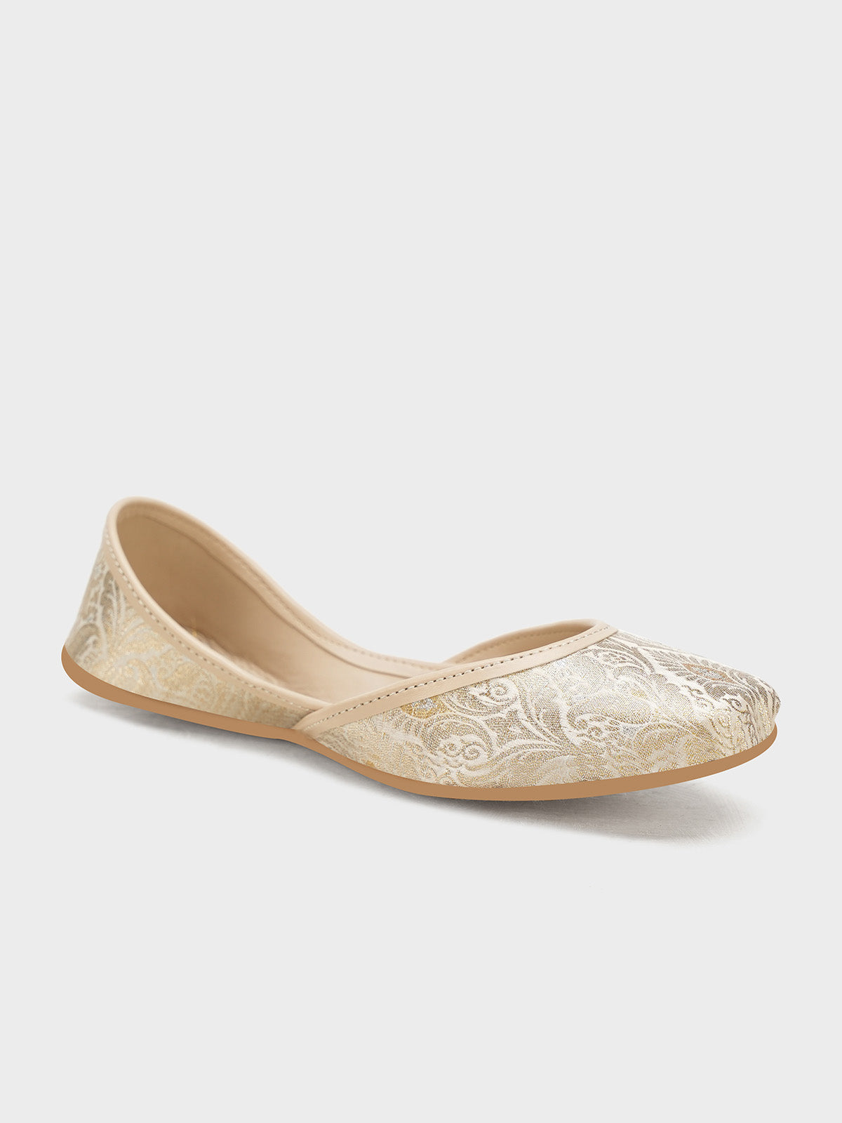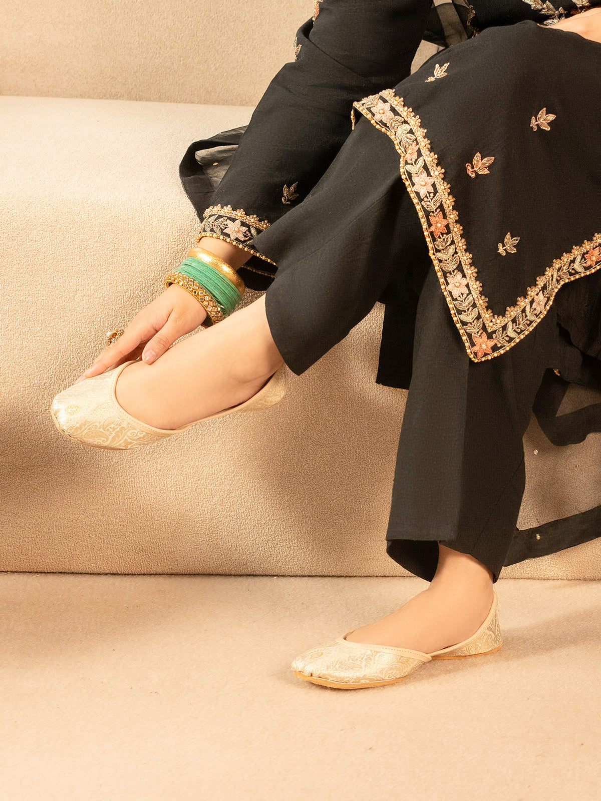 Embrace timeless tradition with these leather khussas, beautifully adorned with intricate Jamawar detailing. Perfect for weddings or festive occasions, they blend cultural elegance with exceptional comfort.