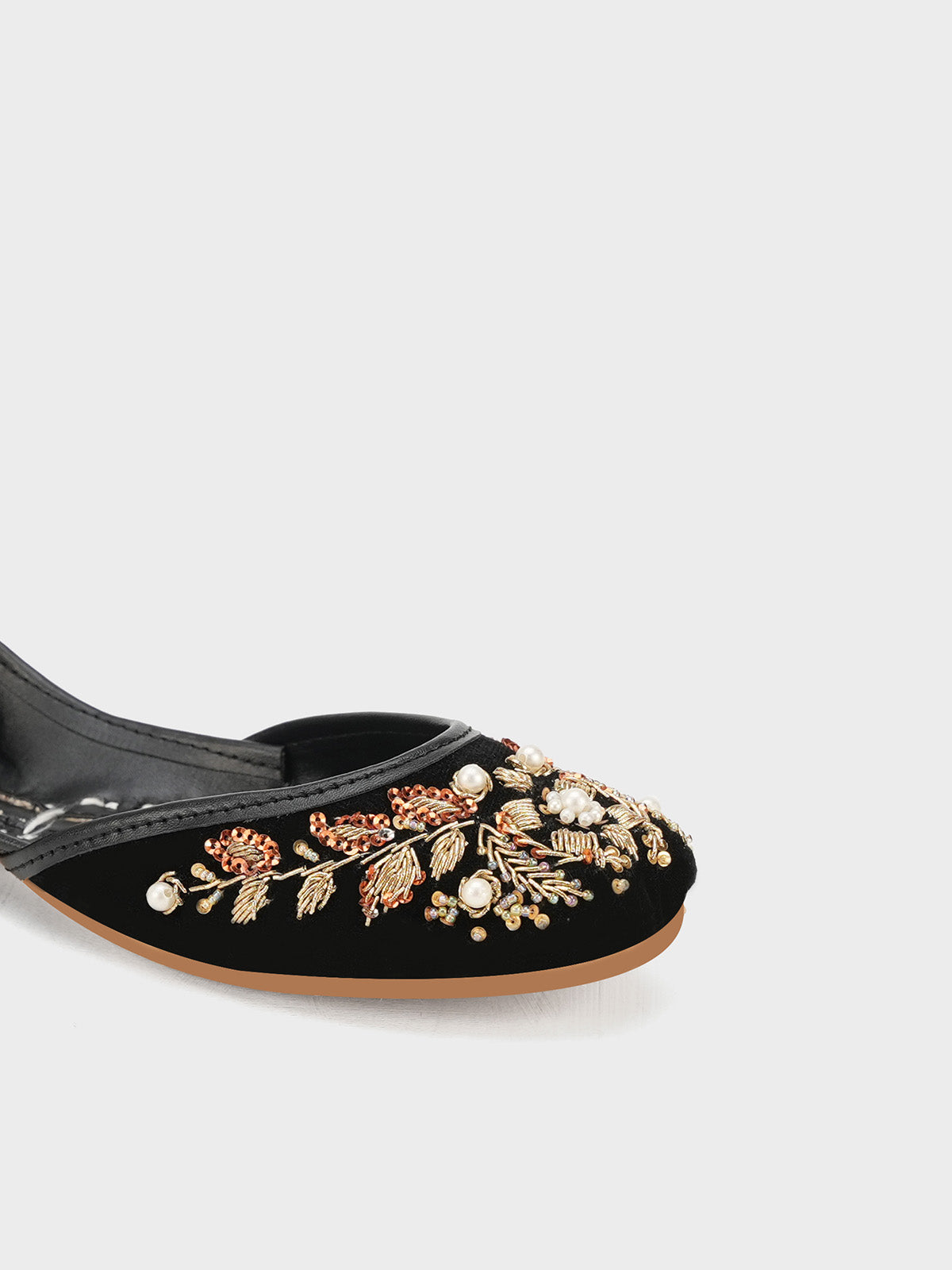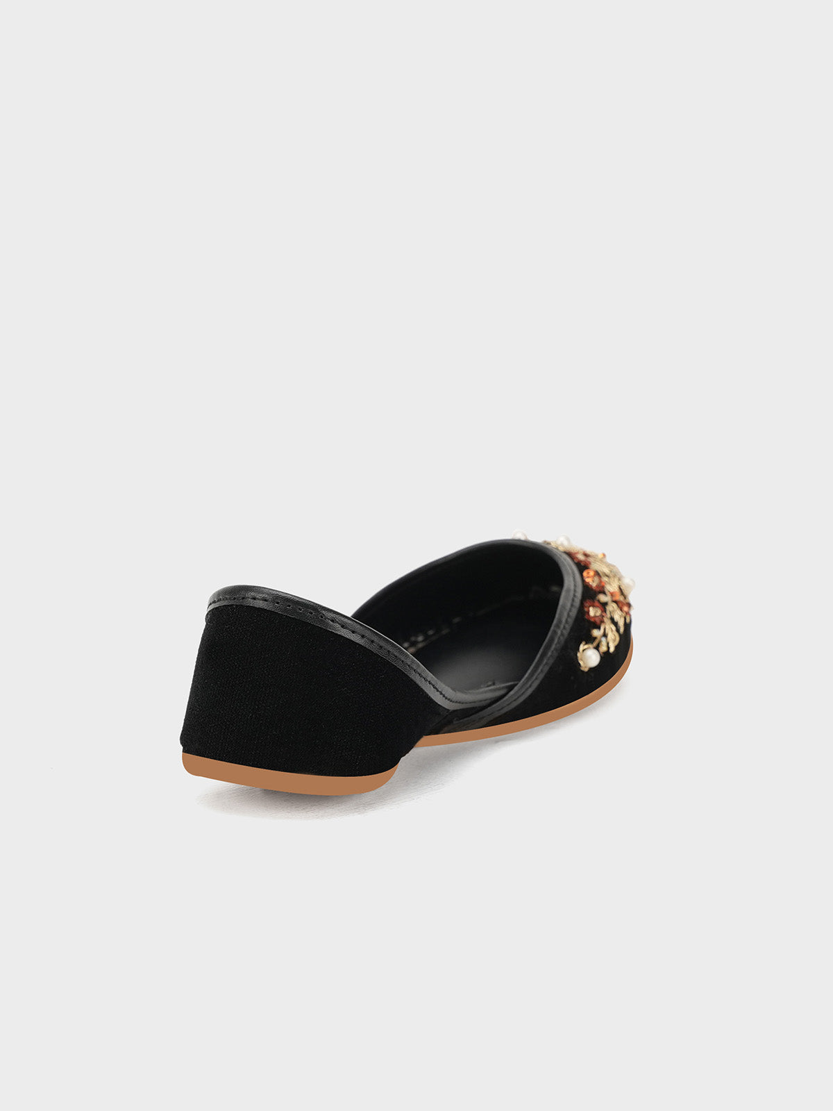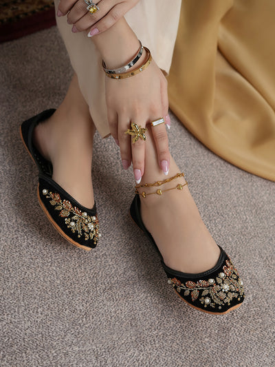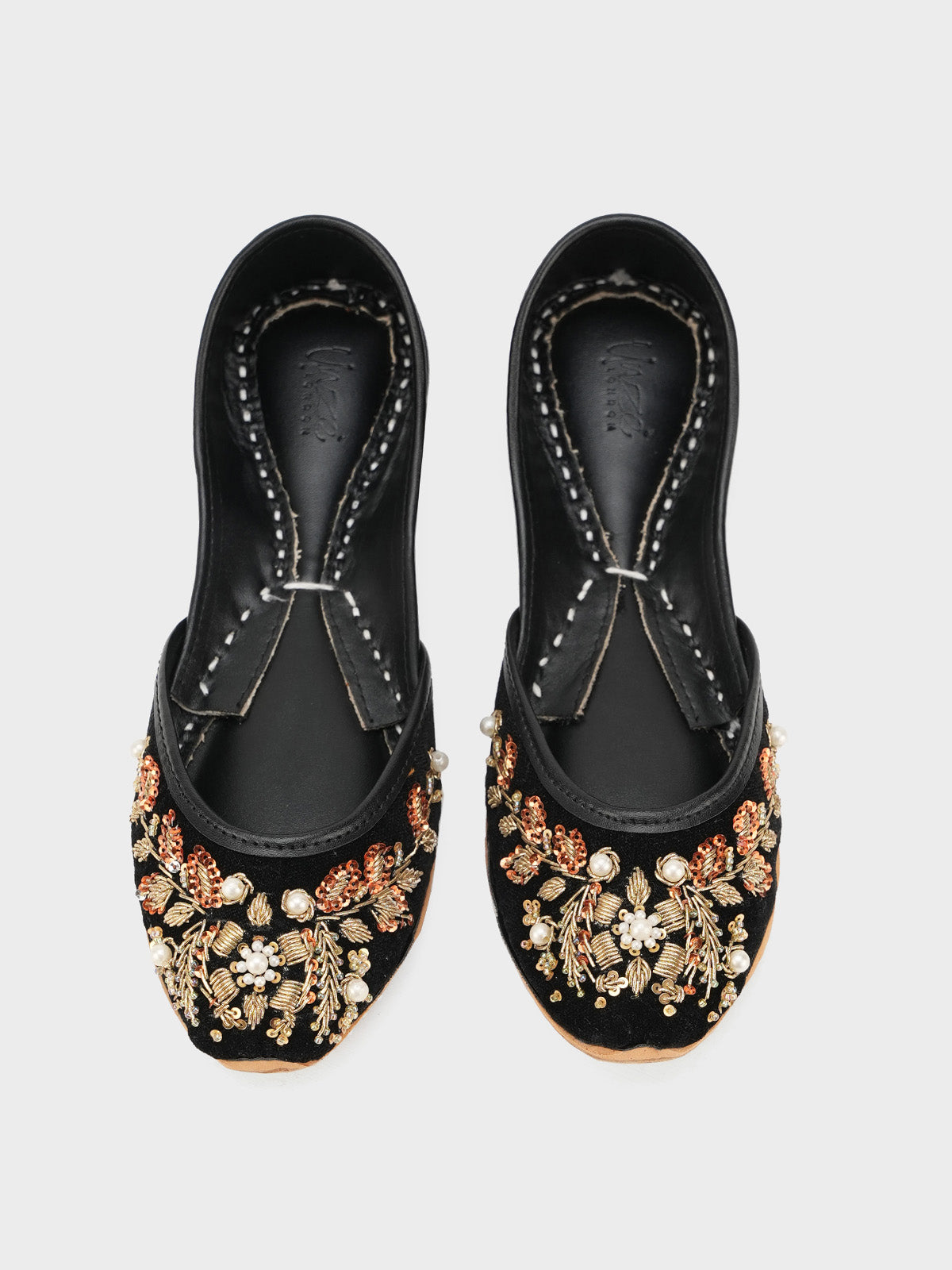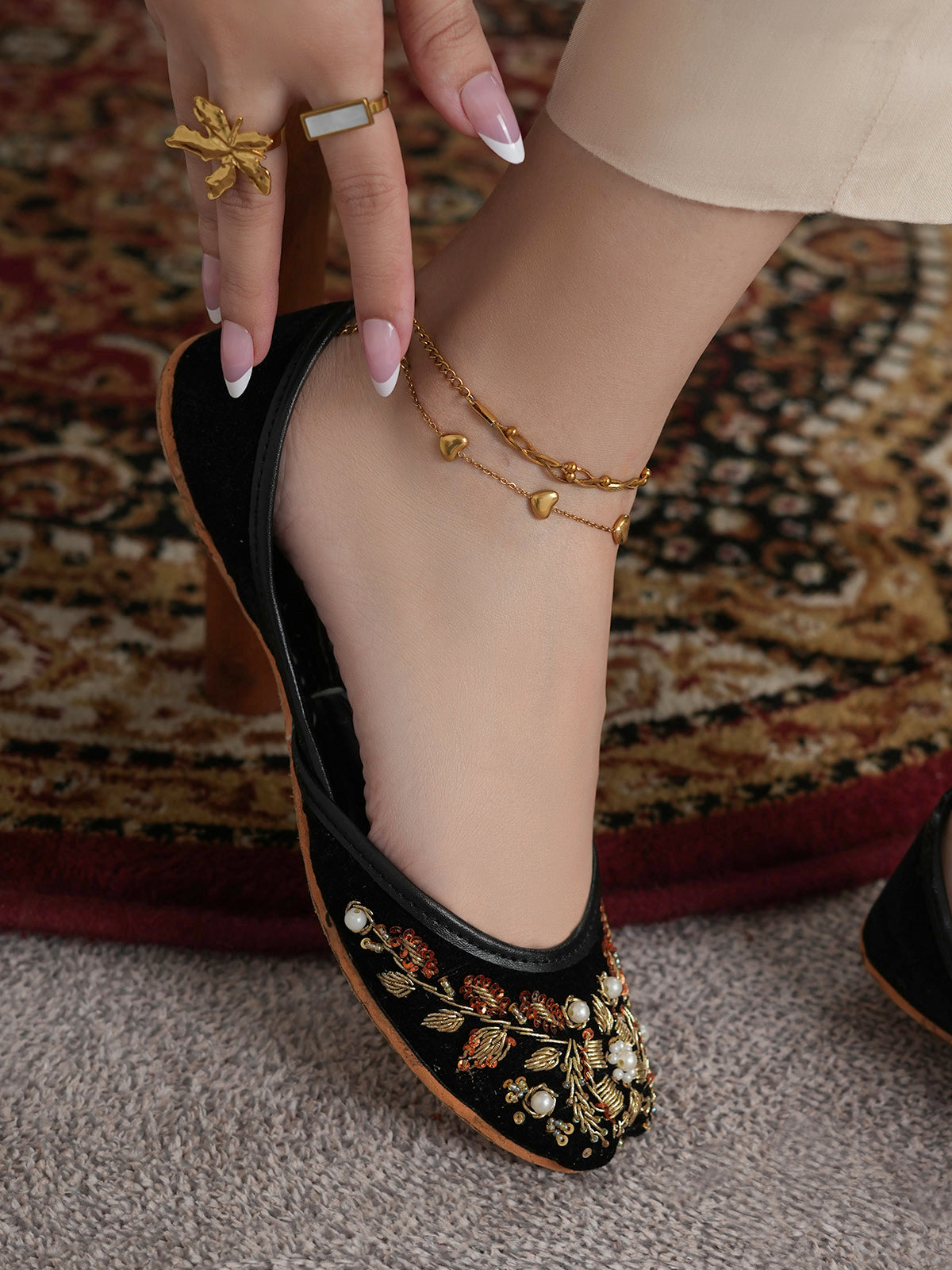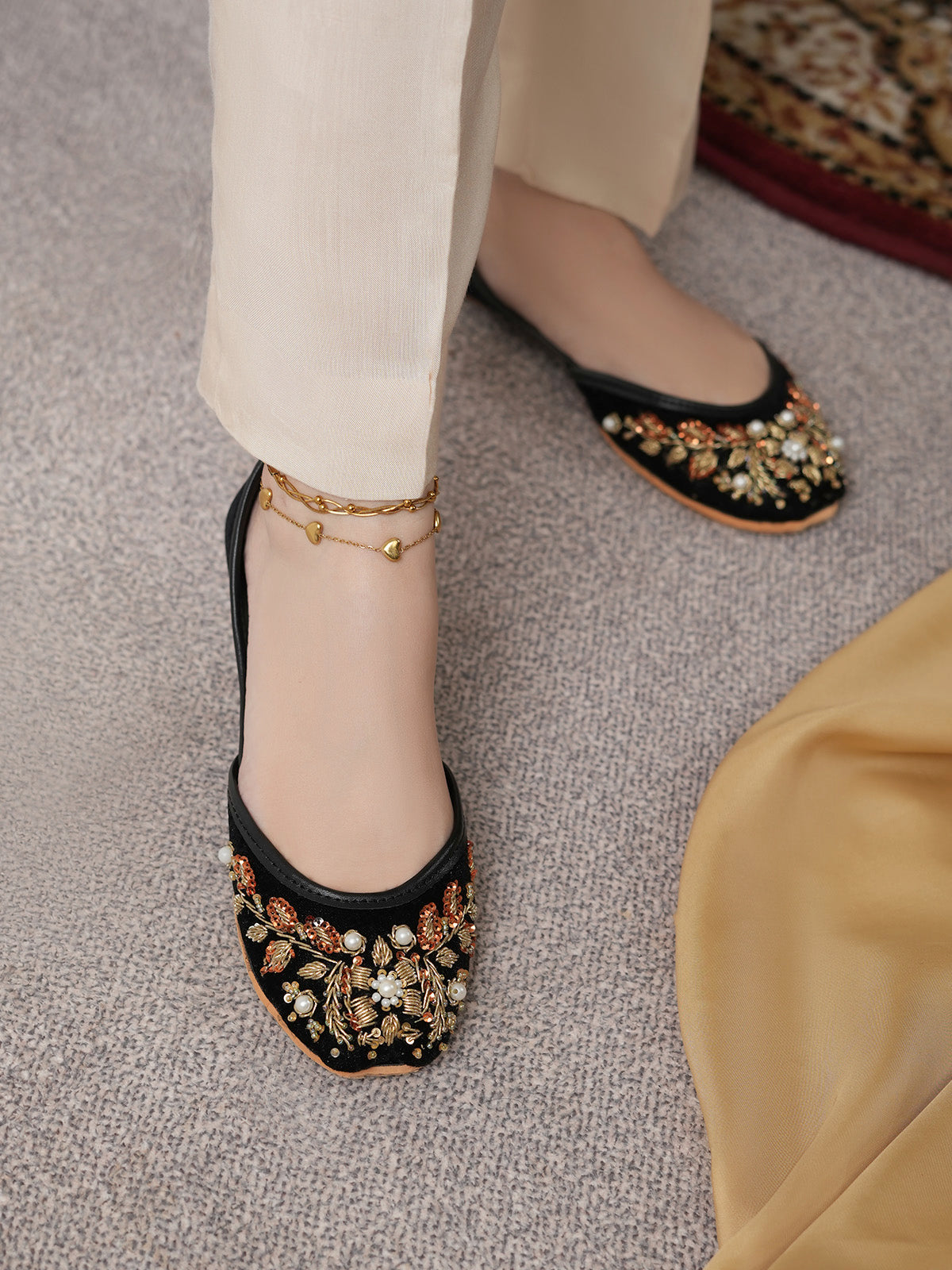 Add a touch of elegance to your style with these stunning women’s khussas. Designed with rich velvet fabric and detailed hand embroidery, the pair is beautifully decorated with pearls and sequins for a luxurious traditional appeal. Featuring a soft inner lining and flexible sole.